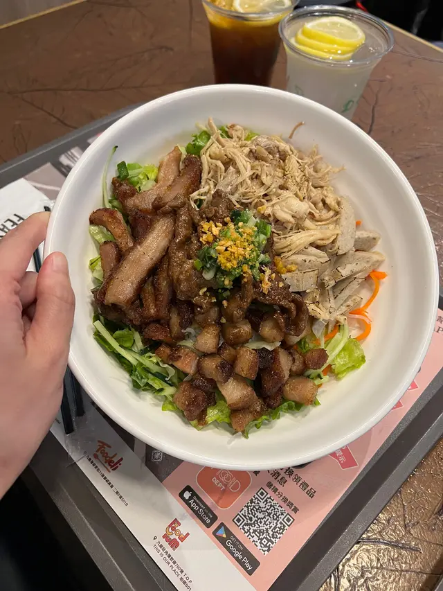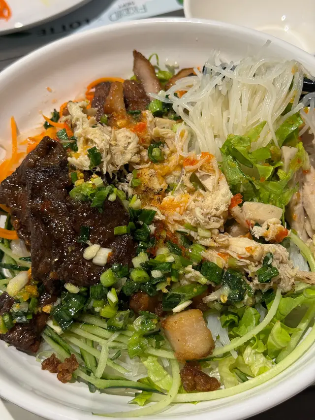 🥢皇牌3+2撈檬粉 $68(手撕雞, 豬頸肉絲, 脆豬肉, 扎肉絲, 烤牛肉)$68勁大碗 真心好抵食覺得份量多到足夠兩個女仔食🤣滿滿嘅餸鋪面烤牛肉有用火槍烤👏🏻撈檬配有青瓜絲 食落好fresh***🥣 Combo dinner🥢牛豬椰汁酸湯檬粉 $94🥢手撕雞沙律🥢手撕雞檬紙卷本身係蕃茄湯 +$5轉左椰汁酸湯椰汁味幾香 但係稍微油左啲配有一小兜蝦油蒜頭店員教要落埋落湯食我自己就鐘意就咁點黎食 更香口🫢一樣都係大大碗手撕雞本身鹹鹹味 好味🤤***🥢秘製沙嗲串燒雞 $29/2雞肉本身有香茅味+埋沙爹醬 啱重口味人士😗***🥢凍檸水 跟餐+$4🥢凍檸茶 跟餐+$4做緊新張優惠 飲品每杯-$8🥳…查看更多