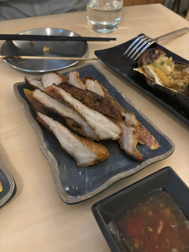 🍢🍢🍢需時製作嘅串燒▫️qr code 落單,免加一🐷秘製燒豬頸肉 -$58一份大約有7條,都燒得幾香,有口感,配咗泰式酸辣醬。🐔燒雞軟骨(兩串) -$28調味主要係用孜然粉,都ok🐟燒多春4條-$38燒得比較燶,都係孜然粉嘅味道🍆秘製金黃香蒜茄子皇 -$48都ok, 蒜味夠濃,但係做唔到皮肉分離,有d難搞,味道偏鹹,條茄子都比較細條,得好少肉。🥢燒腐皮墨魚滑 -$68呢個由落單,去到上菜等咗超過50分鐘,想食嘅朋友要早啲落單。好彩都真係幾好食,外層嘅腐皮好脆,入面嘅墨魚滑都好彈牙,都好惹味,不過都係有啲偏鹹。…查看更多