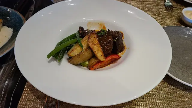 餐廳:Briketenia地點:北角匯菜式:日式法菜餐牌:午市套餐包前菜同主菜,同咖啡或者茶。可以加錢要甜品或者升級飲品。主菜10選1,前菜6選1。餐包一客四件,有大有細,外皮烤得香脆,而且暖暖地,最正係個忌廉醬,超滑溜,令塊包超好味!是日餐湯是日餐湯係南瓜湯,服務員先上一個熱既大兜,原來已經有幾粒新鮮菇仔,然後服務員再係你面前加湯。個湯好滑,甜度適中,溫度夠熱。鵝肝焦糖燉蛋配田園沙律 跟餐加$48 另加一呢個鵝肝焦糖燉蛋配田園沙律係餐廳招牌菜式,一定要試試。鵝肝真係用燉蛋兜上,面頭一層焦糖面,同埋加少少紅色酸莓醬。鵝肝好滑溜,配焦糖面真係外脆內滑,而加埋酸莓醬可以稍稍中和油膩感,呢個配搭非常出色。配有四小塊香脆吐司。田園沙律係一碗加左適量沙律醬既沙律雜菜。紅酒燴牛面頰配新薯及蔬菜 $218 另加一紅酒燴牛面頰有三大件,啖啖肉又超淋,好正,仲有筋添。個汁都好入味。面頭灑上蔥花。伴有五條豆角,一片翠玉瓜,一件西蘭花,一片紅燈籠椒同冬菇一片,蔬菜種類豐富。連皮新薯一件開四邊,好易食。香煎時令鮮魚配海鮮忌廉汁 $238 另加一是日鮮魚為鱸魚。鱸魚一大片,煎得皮脆肉嫰,無骨,方便食用,仲有兩隻連殼蜆仔。個海鮮忌廉汁好滑又唔會太重口味,配魚食好夾。蔬菜同紅酒燴牛面頰一樣。另外有好多滑溜薯蓉。熱檸水,凍檸水(跟餐)熱檸水同凍檸水每杯各有三片檸檬,糖水同糖都另上。總括而言,食物質素幾好。入面裝修高檔次,環境舒適,服務員有禮而上菜有效率。Business lunch可以考慮呢度。…查看更多