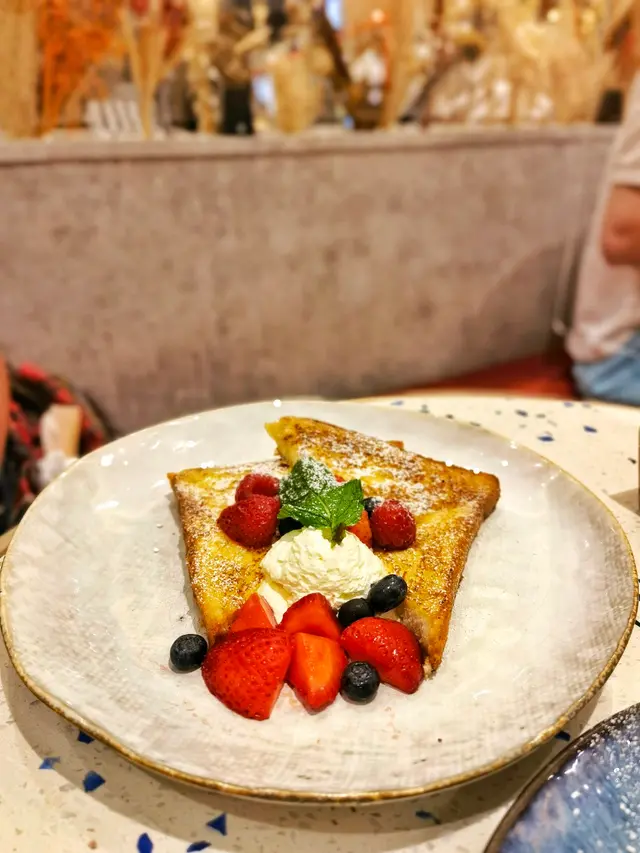 今天和朋友一起去了屯門經過這間餐廳看到有喜歡的白桃梳乎厘,而且還是期間限定的,就馬上來決定來吃這間了!奇蹟白桃梳乎厘(112元)今天的主角,剛送到就感覺到梳乎厘非常鬆軟了,很輕鬆就用刀切開了,吃起來有蛋香和奶香,入口即化的感覺,配上幼滑的忌廉,挺不錯的!而且白桃給的份量也挺多的,白桃吃起來是有點咬口的那一種,有桃香,香甜!白酒蜆肉意粉(88元)這個意粉比想像中的還要足料,蜆肉給得非常多,滿滿一碟都是,吃起來有蜆肉的爽甜!意粉也煮得剛剛好,有點咬口,不會太軟,配上帶點蒜香的醬汁,吃起來挺惹味的!經典法式多士(78元)我還是第一次吃法式多士,吃起來的就是將多士沾了蛋漿再拿去煎香的樣子,吃起來會有蛋香,但外面又煎得焦脆焦脆的,配上香甜幼滑的忌廉,吃起來真不錯!而旁邊的鮮果也酸酸甜甜的,配合多士吃起來不會太單調!抹茶鮮奶(42元)這個抹茶味非常濃,配上奶香十足的鮮奶,澀中帶點甜,而且喝起來特別幼滑!白桃梳打(42元)這個是滿滿打卡氣息的飲品,最頂的薄荷,然後是滿滿的忌廉,再來是大量的白桃肉,接著是梳打,最底的是白桃汁,所以是整杯都差不多都是料的感覺!喝起來有桃的清甜,又有梳打的清爽,然後是忌廉的幼滑,層次挺豐富!…查看更多