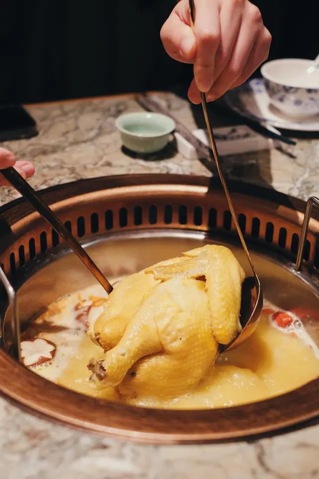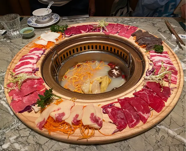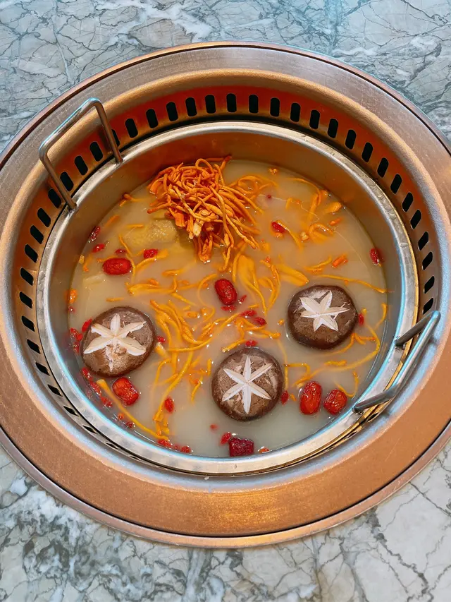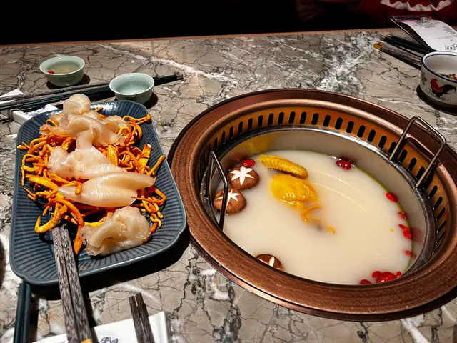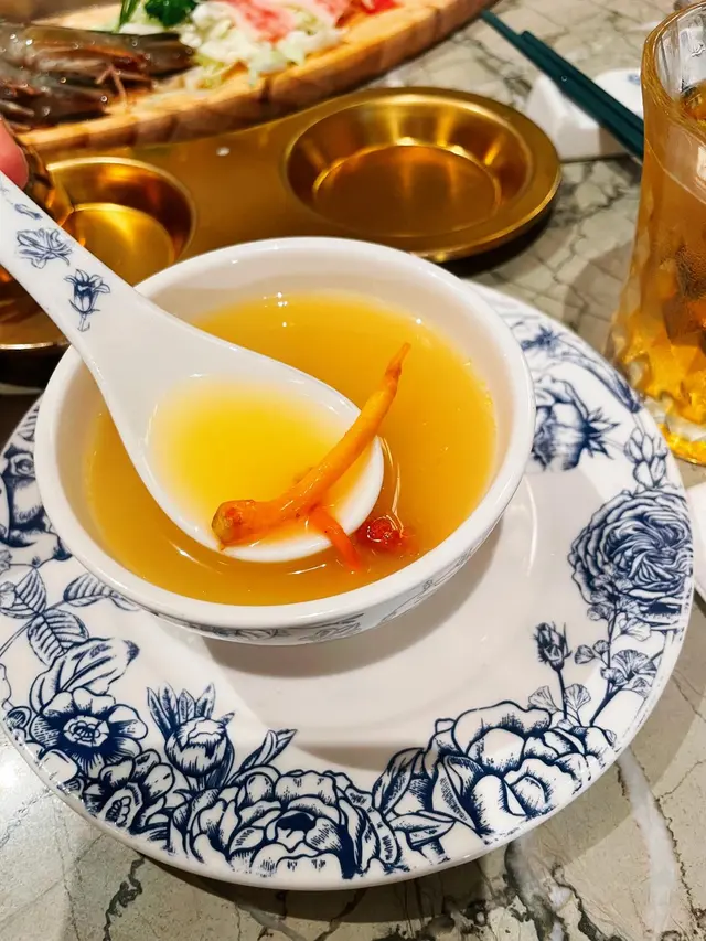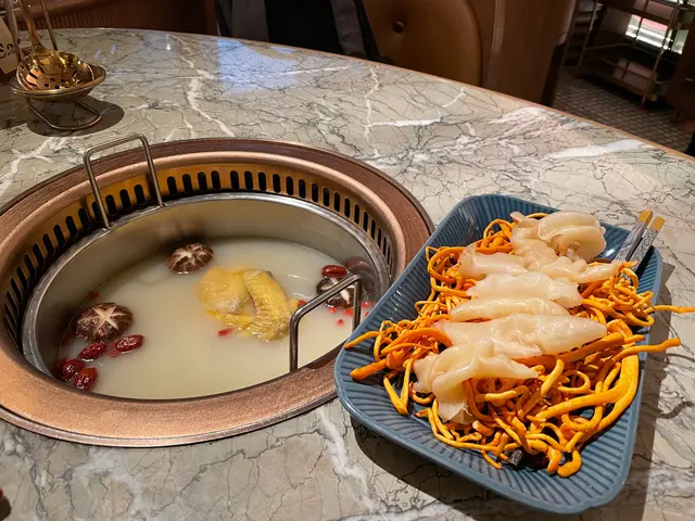 火鍋店行復古優雅風格,店內好多打卡位,近門口有一大個調酒吧枱,店內裝修感覺好高級,空間感十足,座位闊落,店員仲殷勤有禮💯星期日至四$1就可以食到原價$498嘅肉肉同海鮮圈,正價火鍋湯底同配料又有7折,+$38仲可以任飲指定啤酒汽水,連特色飲品都有買2送1,超抵💯一坐低,店員即奉上蘋果茶,潤喉開胃👍🏻琥珀玲瓏山海圈 $1(原價$498)成個呼拉圈咁大,圍著火鍋爐邊,擺盤靚靚,打卡一流;有安格斯肥牛、牛舌、牛𦟌、牛柏葉、黑豚腩卷、黑豚肉、新鮮海蝦等等總共8款。海蝦鮮甜又結實,豚肉味濃,牛唔算好肥,呢個完全超值💯美顏花膠雞鍋 $298好足料,有半隻鮮雞,花膠份量唔少,又冬菇,又蟲草花,雞放咗落湯煮熟咗一陣,店員會幫手切件,雞肉超級嫩滑,仲好有雞味,出乎意料,好少會食火鍋底煲過嘅雞,呢個絕對💯。湯底非常鮮甜又濃郁,一定要淨飲湯先😋脆口珊瑚蚌 $118淥一陣就食得,夠哂爽口西洋菜 $48/冬瓜件 $48/鮮滑腐皮 $38絕少食到火鍋店嘅菜會咁新鮮,應該係嚴選過嘅,連冬瓜都可以咁清甜嘅,抵讃👍🏻仲有熟食嘅小食選擇,黃金鬼五馬六 $88油炸鬼上面係墨魚滑,仲有一層鹹蛋黃包住,有特色又香日熱情密碼 $78有柚子蜜、柑桔檸檬、熱情果汁,火鍋飲果汁類型嘅飲品越飲越開胃,外型超有心思,仲好有誠意咁搭配咗自家製的橙冰,唔會啲冰溶咗越飲越淡💯流星夜 $68顏色紫紫藍藍好靚好神秘,有紅肉火龍果、蘆薈、蘋果汁等等,呢個組合都幾新鮮👍🏻竹蔗茅根 $48好足料煲嘅,打邊爐下火一流👍🏻食物和服務水準絕對一流,環境又有特色,暫時係我嘅火鍋店首選…查看更多