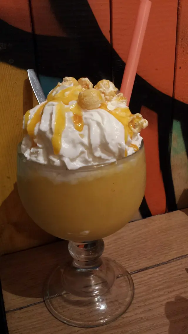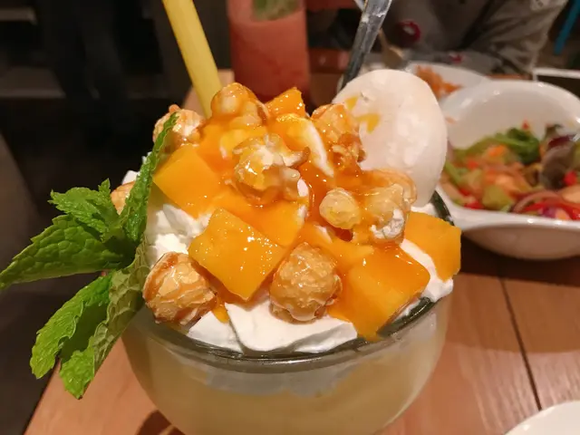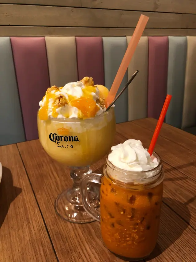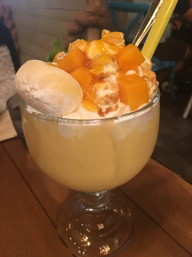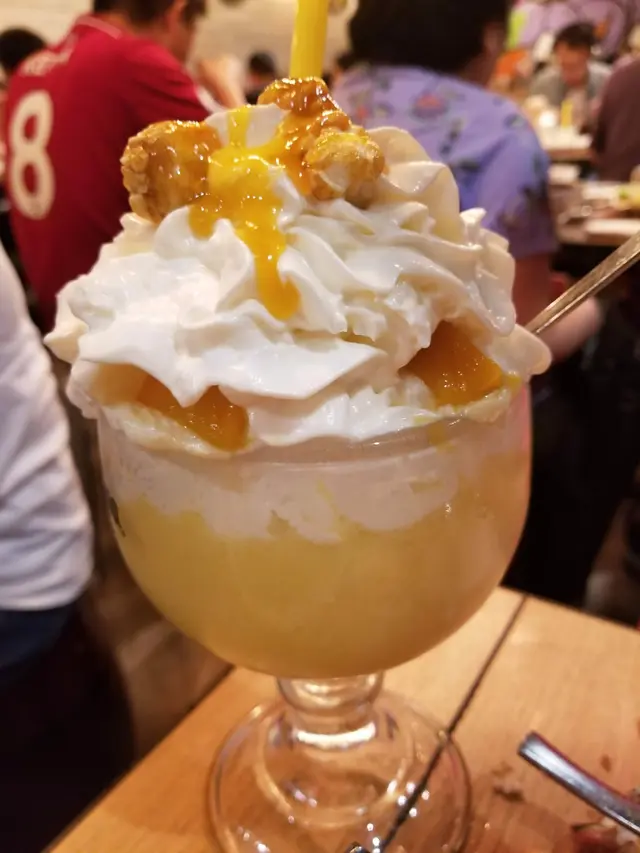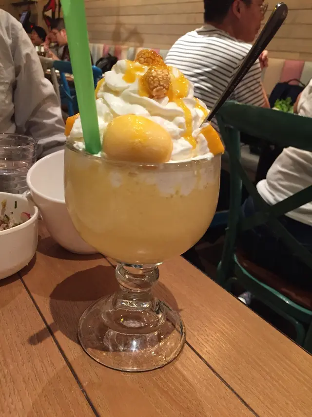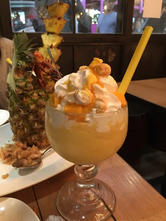 之後上既combo 小食拼盆,有4款小食,每樣兩件,兩個人食岩岩好。個炸蝦球好香好好食!之後既重點來了!招牌菠蘿炒飯配虎蝦! 上枱既時候我眼都突埋!第一次食菠蘿炒飯有呢種視覺上既震撼,整得好有心機!食落炒飯都好香,好足料,有雞肉粒、蛋、提子乾、肉鬆、菠蘿粒;而兩隻虎蝦都應該幾鮮,d 殻好易剝開,非常正呀!我地仲叫左兩杯飲品,呢杯「脆爆芒果園」好巨型呀!係芒果乳酪沙冰,上面有d 爆谷,入面仲有粒芒果麻糬,超級豐富
