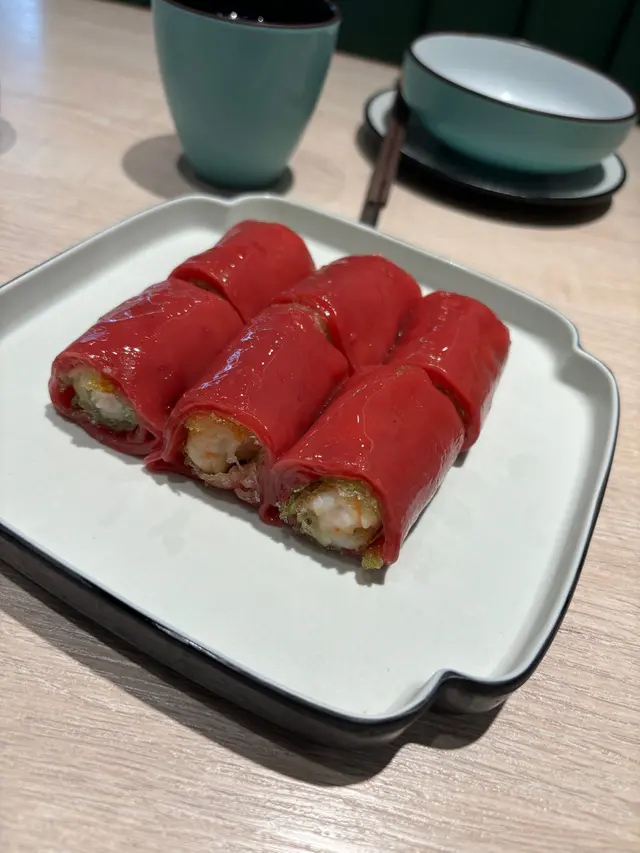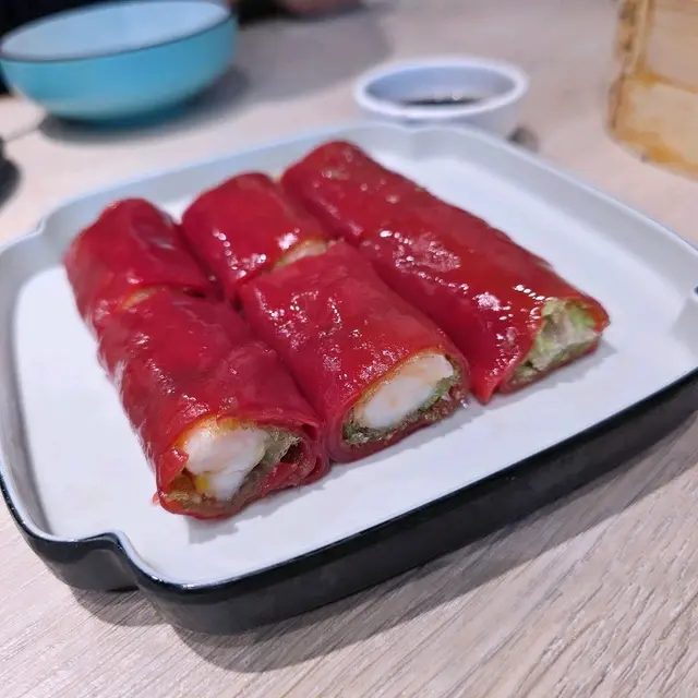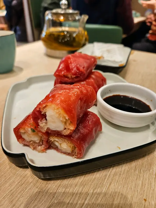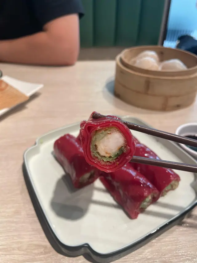 【脆皮紅米蝦腸】最為驚艷,紅米腸粉包著微脆的春卷外皮與鮮嫩蝦肉的鮮甜相互呼應,口感層次豐富,讓人一試難忘。