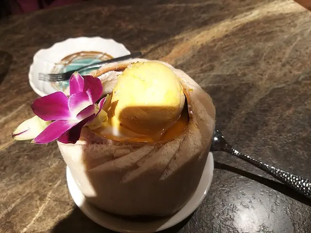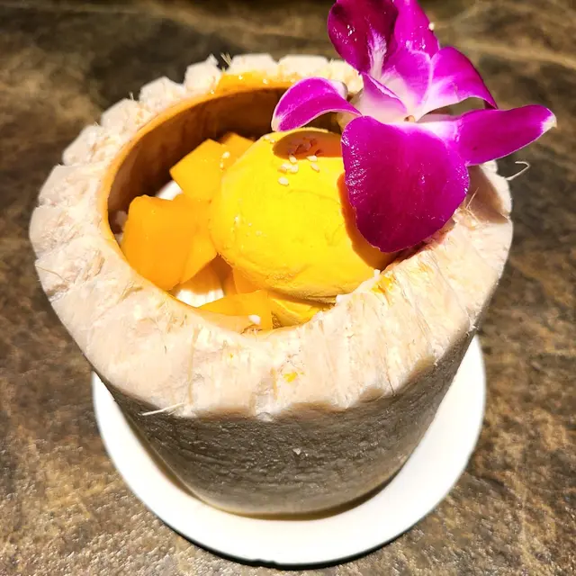 #mochicouple_hk灣仔搵食團鄰近灣仔站🚇嘅泰式餐廳🇹🇭,餐廳連地下有3層,餐廳環境都沖滿泰式風格。坐位闊落,無論少至1-2,多人到一圍圓枱都有位,而且環境乾淨,員工服務態度好好,不時同我哋加水,主食差唔多食完又會問甜品係咪可以上👍🏼👍🏼1️⃣ 飛天通菜($98)都幾大碟, 好足鑊氣😎以簡單的調味料如蒜蓉、魚露和辣椒來烹調😊 通菜嘅口感好爽口而且鮮嫩,唔會炒得過熟,加埋調咗味嘅汁一齊炒,帶有微微的辛辣和鹹味,又唔會好油😛 好味指數:🍡🍡🍡🍡2️⃣ 燒豬頸肉($98)一碟有好多件豬頸肉,外皮加咗香茅絲一齊燒,色澤金黃、外皮酥脆香口😋 而內裡肉質鮮嫩多汁🤩 經過燒完嘅豬頸肉,充滿油香,每一啖都可以食到肉的香氣和微微的煙燻味,搭配特製的醬料,少少酸,好有層次💓好味指數:🍡🍡🍡🍡3️⃣泰式蝦炒金邊粉($118)🤍 賣相超級靚,用雞蛋整成一個網,包住金邊粉😍金邊粉炒得啱啱好,口感滑順,有啲彈牙。加上吸收了濃郁的調味料,酸酸地少少辣,好過癮😚有3隻大蝦,好彈牙爽口,而且份量都幾多😆好味指數:🍡🍡🍡🍡🍡4️⃣芒果雪糕配糯米飯($68)🤍上枱用椰青裝住,好可愛😇香甜的芒果雪糕滑順細膩,好有芒果味,似係自家用芒果汁整成。糯米香甜軟糯,而且仲要熱熱地,加埋雪糕一齊食,我好似冰火交融咁😍 配上帶一點點鹹味的香濃椰漿同香甜嘅芒果粒,值得一試!好味指數:🍡🍡🍡🍡🍡…查看更多