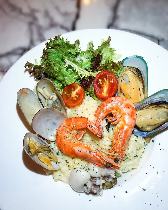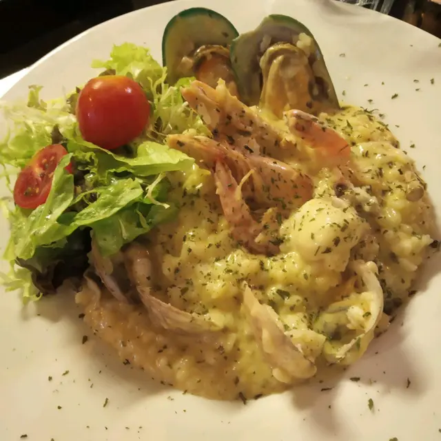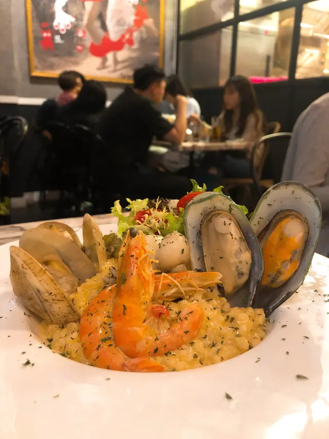 今日因為要遷就朋友遲咗放工,特登為咗佢嚟我好少嚟嘅長沙灣區食飯😆❣️地頭蟲朋友帶咗我嚟呢間餐廳💕門面幾靚🤓 餐牌都好吸引🤤入到去環境都唔錯,好多好有藝術感嘅掛畫😯燈光都好浪漫☺️我哋今日點咗➡️鐵板A餐 經典港式雜扒餐 $158跟餐有牛角包🥐➕南瓜湯💕南瓜湯南瓜味超濃郁❣️質感好rich🥰 出色👍🏻牛角包香熱♨️酥脆又大個🤩.一見到個鐵板餐...除咗震撼我都唔知用咩來形容🙈疊到好高好大份😍我地今日揀左配菌皇黑松露汁,不過食落就覺得汁嘅份量唔係太夠~🐖豬扒好厚好大塊❗️質感適中,唔會過硬或過軟,咬落好實在☺️ 蘸多少少松露汁更惹味🥰🐓雞扒大件又多肉汁💦唔會好似白烚雞肉咁,亦冇雪味👍🏻 肉質鮮嫩彈口❗️另外仲有雞翼、雞肉腸及單邊煎蛋~.芝士忌廉海鮮燉飯$168賣相勁靚😍有兩隻蜆、兩隻蝦、兩件青口➕一隻大八爪魚😍八爪魚好新鮮,食落好爽口🤓蜆肉都係❣️🦐蝦肉都好彈牙好重蝦味❗️呢度海鮮係唔錯👍🏻燉飯微微芝士味➕勁Creamy 嘅口感,食每一啖都係一個滿足🥰.另外仲跟餐加咗個$8嘅水果茶🍹味道唔算好甜,幾健康咁😌雖然果味亦唔算特別重,但勝在飲到水果香➕茶澀味,味道唔錯亦可以解一解滯👍🏻.最後嗌多杯橙汁,大家都有野飲❣️…查看更多