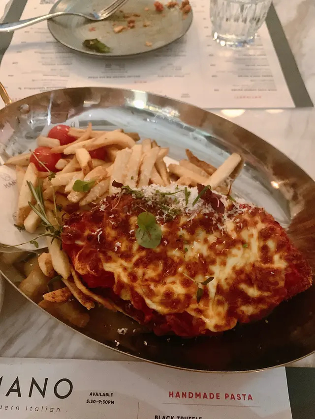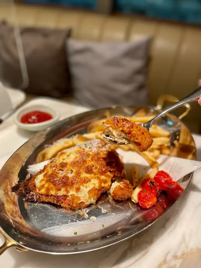 今次試下一間意大利餐廳,環境燈光昏暗,有情調,裝修簡約優雅,係一個放工後傾偈嘅好地方。新鮮黑松露蘑菇扁意大利麵餐廳主打手工意粉,麵質咬落去彈牙,意粉汁creamy,而且黑松露蘑菇味都非常濃郁,意粉上面仲有新鮮黑松露片同埋蘑菇,增添香氣,必試之選。芝士焗牛肝菌釀脆炸雞胸配薯條出面比較少見嘅菜式,雞胸肉炸至非常香脆,咬落去食到夾住既牛肝菌,表面既芝士焗至微微焦香,口感豐富,配料炸薯條用上粗身嘅薯條,炸至非常香脆。提拉米蘇提拉米蘇入口順滑,口感濕潤綿密,甜度適中。…查看更多