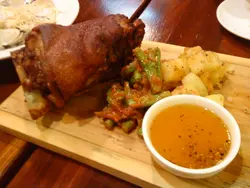 芥蜜脆皮原隻咸豬手($98x2)-自家醃的名物豬手份量極巨,外皮甘香脆口之極,中間則肉質細嫩且有豐富筋位+骨膠原,點上店方特製的芥蜜汁,相當香口美味。而且每份豬手又附豐富薯菜(也不錯!),兩份下來已經佔去大部分胃納! 是款美味但要分享的菜式~
