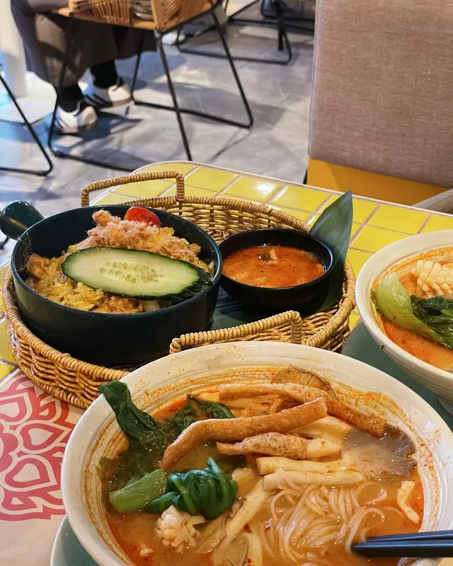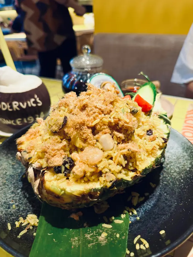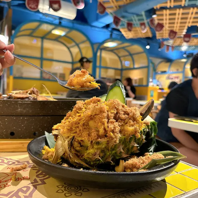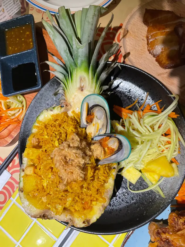 油麻地嘅明星餐廳由Mirror同Error成員主理,人氣十足餐廳裝潢以黃、藍色做主調精神又shape,影相一流🤩 🔅冬陰功烤魚一般明爐魚都用烏頭,呢度選用爐魚爐魚好處係無咩細骨仔,所以啖啖肉而且因為烤過,魚皮邊邊帶點焦脆但魚肉依然嫩滑,好味 🔅菠蘿海鮮炒飯食泰菜必點之一炒飯夠乾身,面頭鋪上超多肉鬆掀開內裡有蝦肉、蜆肉、青口加上菠蘿,鮮甜咸酸有齊,加埋果仁又加脆口感覺 🔅燒豬頸肉爽口彈牙,邊位亦燒得點焦脆香口 …查看更多