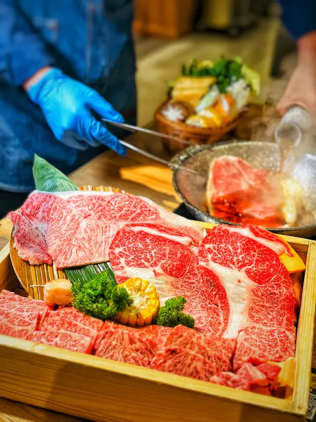 外面有些熟食和飲品可以自取,例如前菜、炸燒賣、餃子、日式小丸子、日式咖喱牛筋腩、麵食等。而飲品除了有一般的盒裝、支裝飲品之外,還有飲品機可以沖製咖啡、朱古力、牛奶等。我們入座後,職員先送上薩摩和牛拼盤壽喜燒,然後把牛肉和蔬菜籃的蔬菜先後放入鍋裏,再加上壽喜燒醬汁。職員幫我們涮好薩摩牛特上西冷後就放在我們的碟上,其他牛肉我們就自行燒烤。薩摩牛特上西冷十分大塊,而且牛肉肉味香濃好吃!把牛肉沾上雞蛋漿,除了香濃的蛋香味外,口感更加滑溜啊!蔬菜有冬菇、金菇、粟米、南瓜等,吸收了壽喜燒的醬汁後更加美味。而主角日本薩摩和牛,牛肉油脂非常豐富,可以看到牛肉的油花分明,燒過之後放進口裏,可以吃到牛的濃郁油脂香味。海鮮方面,有白鱔、虎蝦、磯煮鮑魚、蒜香牛油帆立貝、雞泡魚乾、香草芝士燒生蠔、油甘魚鮫等。我最喜歡雞泡魚乾和甲羅燒,雞泡魚乾經燒過之後味道香口,不過大家要注意時間呢,容易燒焦。而甲羅燒蟹膏味道濃郁,我吃了三個,配飯吃簡直一流,在吃放題之下,我竟為了甲羅燒吃了一碗飯,可見這個格羅燒味道真的不簡單啊!推介!🍜麵食我們點了冷柚子烏冬和咖喱牛肉撈烏冬,兩碗份量都不少,冷柚子烏冬味道清新,咖喱牛肉撈烏冬充滿咖喱香氣。🍨甜品、水果也是自取的,甜品有和菓子、蛋糕、啫喱等,而雪糕有日本雪糕雪條,我最喜歡雪米糍,有荔枝和梨味,味道特別,清新帶少許果甜味,不會太甜太膩,一口size,我都吃了好幾粒呢!