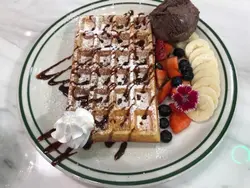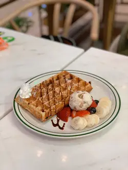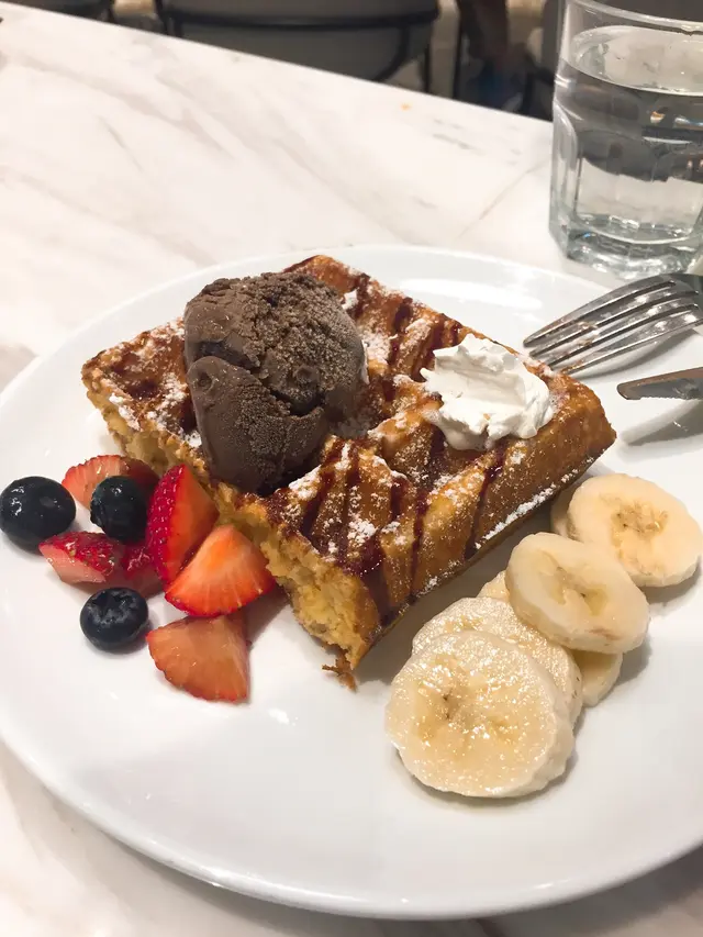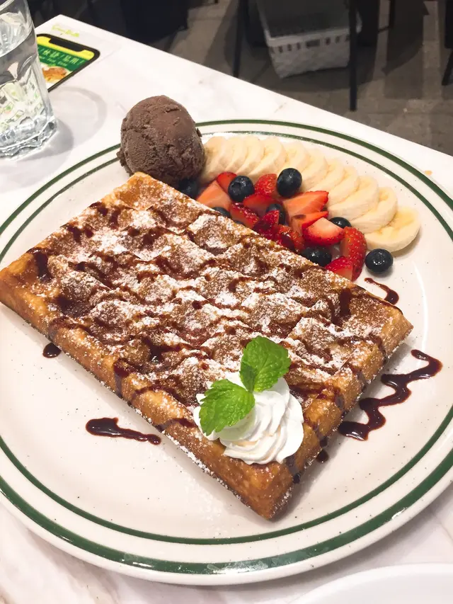 一直都好想試下Green Waffle嘅窩夫,個晚差唔多九點經過,見到八點半後所有甜品七折,所以就入左去試下🤭佢地嘅窩夫除左最普通嘅原味窩夫之外,仲有得揀蕎麥窩夫、班蘭窩夫或者白/黑朱古力豆窩夫嫁!**********<藍莓香蕉士多啤梨窩夫> $82窩夫有得揀自選或者組合,計返窩夫組合應該會比自選抵食啲,所以就點左個藍莓香蕉士多啤梨窩夫,再加左$28要Movenpick雪糕!窩夫嘅口感似布魯塞爾窩夫,食落空氣感較重,所以會鬆脆啲無咁厚實🤔…查看更多