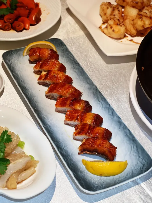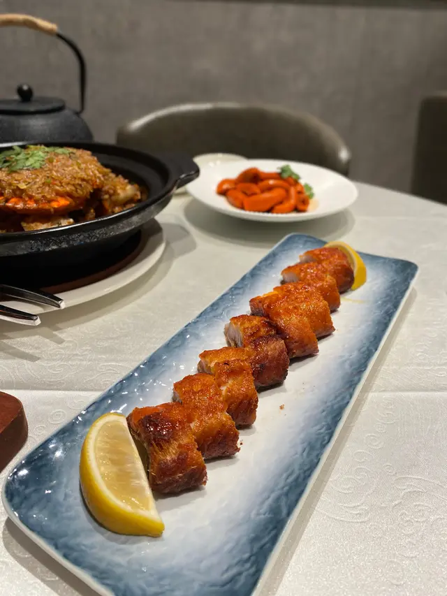 這間人氣中菜館於銅鑼灣開設新旗艦店,主打傳統又具創意的經典粵菜,訂座率經常爆滿!新店環境寬敞舒適,裝潢清簡淺白作主調,配搭清雅的山水畫作,帶出江南蘇杭的閒靜感覺,同樣設有貴賓房,適合約會或多人聚會。前菜 - $25金黃色的椒鹽白飯魚,入口香脆,略帶椒鹽香。黑松露燒鵝(1/4隻) - $238嚴選優質的黑棕鵝,有骨細肉嫩及體肥皮滑的特質;以自家秘製醬汁醃製,有著濃厚的黑松露飄香,即叫即燒的鵝皮特別香脆,一咬嫩滑的鵝肉充滿著豐富香甜的鵝油脂香,肥而不膩。糯米炒膏蟹 - $588大大隻膏蟹的蟹蓋及蟹身均有著豐腴的鮮橙色蟹膏,連糯米也夾雜著蟹膏,軟糯黏嘴、綿密微甜;煙煙韌韌的糯米吸飽膏蟹精華,更有少許鍋巴,香脆鮮味。蜜汁脆燒鱔 - $278細膩肥腴的白鱔肉充滿彈性好鮮美,燒至金黃帶點焦脆香口,甘香的魚脂香配上特別調製的蜜汁,令人回味。滷水豬生腸 - $158港式懷舊街頭小吃之一,只有母豬身上才有,口感爽脆不膩,非常彈牙爽,可蘸上甜醬芥辣。涼拌豬腳筋 - $98港式懷舊美食之一,經過多重工序預先浸泡、料理酒薑蔥辟腥,再以花椒、桂皮、香葉、八角及調味料煮製三小時,豐富膠原蛋白入口彈牙爽脆。法式蜂蜜芥末蝦球 - $178多隻去殼去腸的鮮大蝦爽滑彈牙好脆嫩,沾滿微鹹甜香又微辣的醬汁。 …查看更多