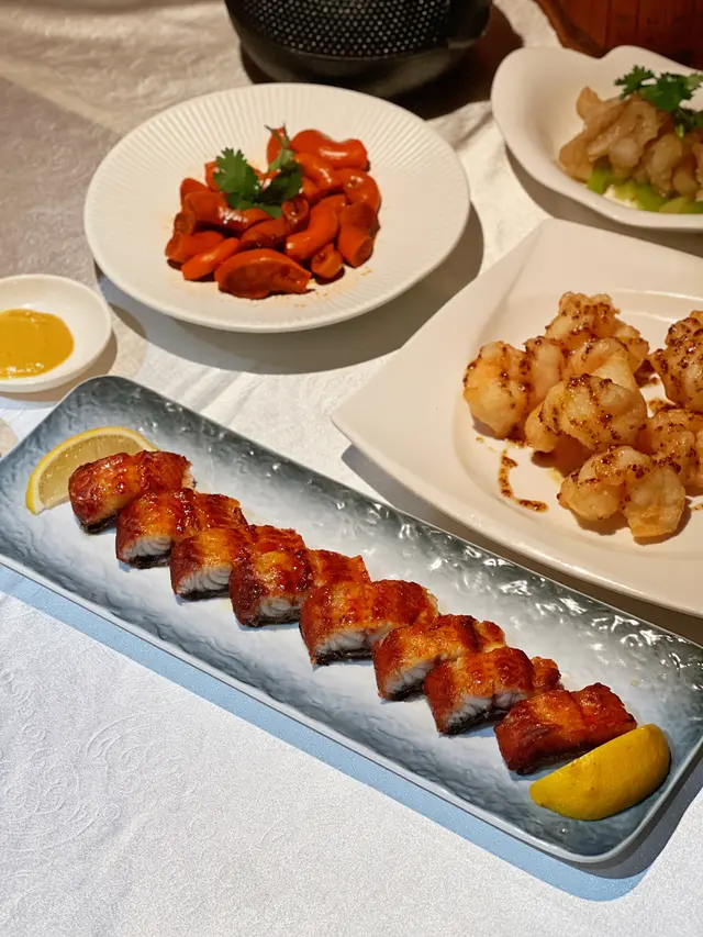 銅鑼灣的登龍街多美食就眾所周知,最近開了一間那裏少有的中式的海鮮酒家,看到菜式選擇很多,而且一些比較傳統經典的菜式都有呢!十分適合和家中的老一輩過來吃飯,我自己也很欣賞這些特色中菜唷,菜式特別又好吃~地面的職員先接待我們,然後扶手電梯下去地庫,就看到以山水畫背景裝潢,紅色的紙燈籠和木簾帶有中式味道。兩對筷子模仿玉,細緻精美,木奏摺是飲品Menu,非常有趣和有心思唷!而且菜式非常的多,都花了一段時間挑選,燉湯很受歡迎,很快就售完,我們也錯過了,想喝的要早點下單啊!.餐前小食$25不是酒樓一貫的花生,是酥脆的炸魚仔,誠意十足呢!.♡糯米炒膏蟹$588 🥢必點🥢上菜時職員都貼心提醒我們小心煲熱。整隻膏蟹配上糯米飯,熱辣辣香噴噴的,糯米飯口感軟糯,蟹膏配糯米飯十分香口,底部還有脆脆的飯焦。♡黑松露玻璃燒鵝$238 🥢必點🥢¼隻賣相非常吸引,黑漆漆的好像玻璃反光的玻璃燒鵝,吃下去有陣陣的黑松露香味,每件燒鵝都皮肉相連,油脂豐富,鵝油味香濃,附上燒鵝汁和梅子醬。♡蜜汁脆燒鱔$278外皮燒得很香脆,跟平常一貫吃的鱔口感味道都很不同,用上蜜汁,吃下甜甜的。♡燒汁芥末大尾魷$138燒汁芥末加洋蔥香炒魷魚的,芥末味帶點香口刺激。♡手拍青瓜$68蒜蓉和芫荽味道很夠,配上清爽的脆青瓜,開胃又惹味。.✔️餐廳設加一服務費 …查看更多
