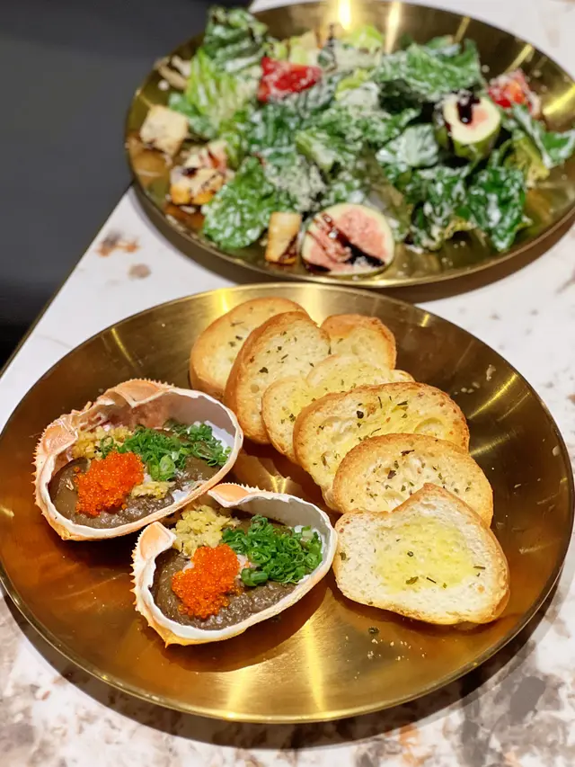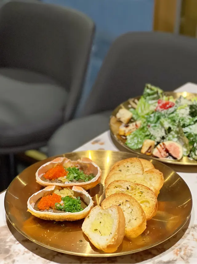 這間新開的西餐廳位於尖沙咀The Nate,鄰近佐敦站,主打精緻的西日料理。店內環境寬敞舒適,裝潢採用簡潔的日系木為主,座位以高身的吧桌椅為主,適合約會、多人聚會。一月份逢星期五六有Live Band表演,可點唱之餘,又可以上台唱歌。富蠔黃金蟹粉SET DINNER - $698/位期間限定優惠買一送一凱撒沙律新鮮翠綠的沙律菜淋滿鹹香的凱撒沙律醬之餘,又撒滿巴馬臣芝士粉,麵包糠香脆有口感,還有香甜多汁的無花果及車厘茄,清新無比。蟹粉蟹肉甲羅燒多士蟹蓋上釀滿了經味噌調味的蟹肉蟹膏,陣陣豆香帶點甘香的蟹味,塗上香脆的蒜蓉多士,口感更豐富。香烤蟹粉蟹肉釀雞翼金黃色的烤雞翼,雪白的雞肉嫩滑多汁,咬開流出濃濃的雞黃油,又釀滿了蟹粉蟹肉非常甘香香甜,還有黑醋沙律平衡膩感。蟹粉蟹肉海鮮雜錦Pizza即叫即焗的自家製Pizza,批邊極鬆脆,中央部份較軟心,有半溶化的芝士富奶香,又有甘香的蟹粉,還黏著魷魚、鮮蝦等海鮮,鮮味十足!海膽蟹粉蟹肉忌廉墨汁意粉黑漆漆的墨汁意粉煙韌彈牙,有著獨特的鮮香味,掛滿順滑的蟹粉忌廉,有絲絲甘甜的蟹肉絲,兩塊肥美飽滿的海膽豐腴得入口即化。…查看更多