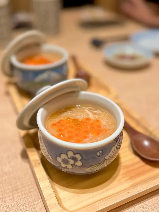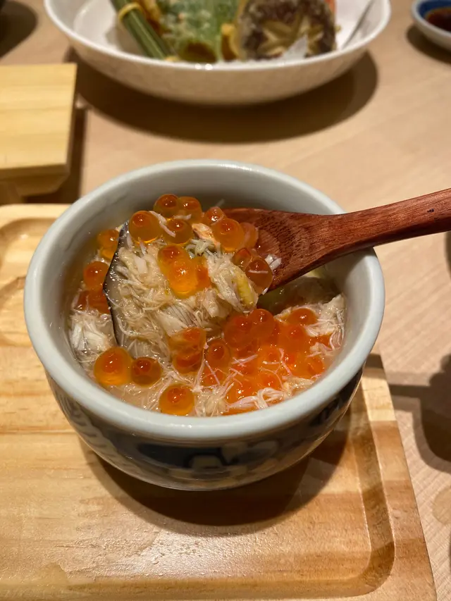 悶熱的天氣,不想吃得太肥膩,我們選擇了日本菜。沙律表現正正常常,生菜、青瓜、粟米粒、車厘茄等等鮮爽,襯以胡麻醬不會難吃到那裡去,只是找不到亮點。至於味噌湯雖則夠熱,奈何味噌的味道根本釋放不出,過淡不夠濃香。接著就是精彩部份的開始。北海道毛蟹蒸熟之後全部拆肉,啖啖肉的享受確實暢快無比!當蟹肉的香氣在口中徘徊遊走之時,再進一步加上蟹膏的點缀,鮮美沒法擋!北海道紫海膽原隻呈上,單是看到經已不禁口水狂流!海膽鮮香不已,食得出海水的味道,細滑到一滑入喉,足証是高質食材。配合脆卜卜爆汁的魚籽,絕妙的相得益彰!肥美的生蠔一點也不腥,軟滑飽滿,簡直是大滿足!兩款刺身分別是吞拿魚腩及三文魚,兩種的油份皆相當充裕,而吞拿魚腩更為豐厚。還有壽司的飯亦調過味,和味之至!天婦羅蕎麥麵的天婦羅有蝦、紫蘇葉、茄子及蕃薯等,而盛合則多了小尖椒、帶子以及冬菇。全部都香脆不膩口,水準之作。蕎麥麵亦不得了,麵條食到麥香,高湯更是非常可口!蟹肉海鮮蒸蛋即茶碗蒸,一揭開碗,已見到大量蟹肉及魚籽,再用匙羹舀起來,發覺裡面還有蝦、冬菇片,蒸蛋香濃水滑,再加上蟹肉以及冬菇,香上加香!首次來訪已是驚喜連連,真的一食入魂!