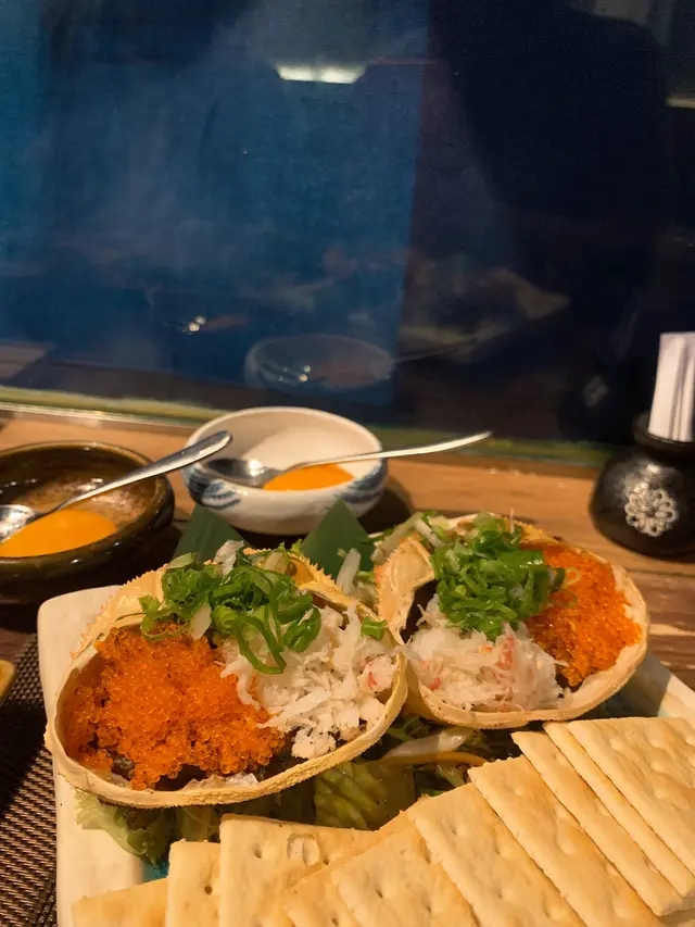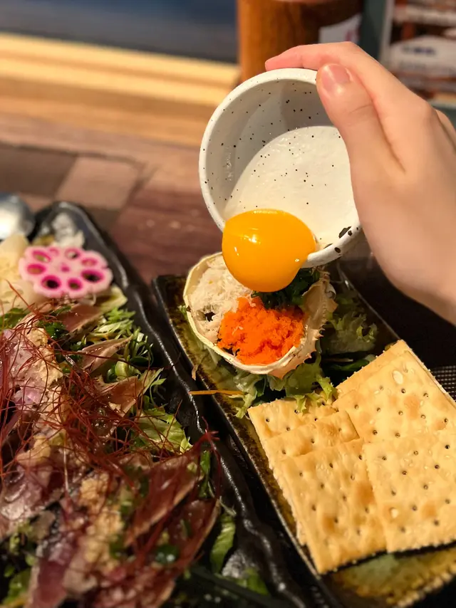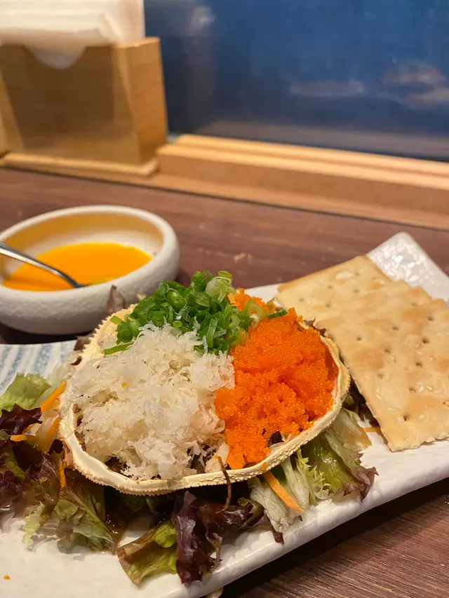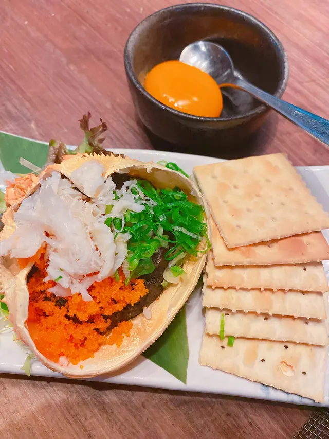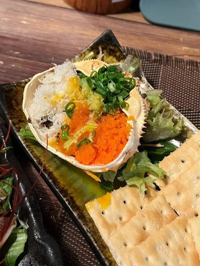 今日去左一間好正既日本餐廳。這間餐廳位於太子地鐵站附近。店鋪唔算好大,但裝修都好有日本feel。好像去了日本啲平民小店咁。我地坐低先叫兩杯啤酒,然後叫左以下既食品:古早蟹籽沙律這是黎既第一道菜。一道開胃既菜。整份沙律都好大份。配沙律醬,菜和蟹黃。酒盜芝士食法是放一舊芝士上餅乾上面,然後點少少醬咁食。芝士味好香和好濃。是一款好開胃既小食。日本蕃薯跟左黎既係燒蕃薯。共有三舊。甜甜地同燒得剛剛好。青森青提豚肉卷一塊豚肉包住一粒青提子。一咬落去啲青提汁會爆出黎。好正😂蟹肉蟹羔甲羅燒蟹肉,蟹黃,蔥再加上下面好多既蟹羔,可以全部一大舊配餅乾再加沾一些蛋汁食。鐘意食蟹羔既一定要試試。芝士玉子燒芝士和蛋係好好既配搭。蛋捲非常厚身,中間配一大舊芝士,啲芝士仲多到可以拉絲。 非常滿足。串燒 - 雞頸肉,牛蒡素肉丸串,亞波美手羽先跟住黎既係串燒組合。手羽燒到好脆口,再加了些檸檬汁非常好味。牛蒡素都好大粒。雞頸肉都好惹味。松露半熟牛肉他他牛肉外面是熟的。中間燒到半熟。加上蔥,松露和柚子汁,牛肉又軟,好容易入口。我食到停唔到口。這道菜是我的推薦。媽媽鹹蛋豚肉卷這個都係串燒黎。一串豚肉卷上面配鹹蛋醬,非常惹味,值得一試。蒜蓉燒室津生蠔(兩隻)最後就是今日既主角 燒生蠔啦。好多既蒜蓉加到燒生蠔上面。啲蒜香味唔洗講都出曬黎。…查看更多