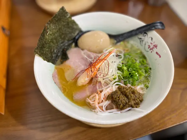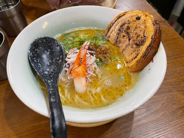 入面舖頭唔算好大,目測可以坐到大約20人,如果夏天會比較熱,因為冷氣唔算好夠麵底嚟講有兩隻:白麵(博多),比較幼身,硬少少,適合配濃湯黃麵(東京),粗少少,比較滑,口感好啲,適合配淡湯第一碗海老拉麵好好味呀,所以我食過兩次,個湯幾濃,非常重蝦膏香味,上面亦有啲櫻花蝦乾,將成個蝦湯嘅鮮甜升華到另一個層次,非常濃郁,因為濃郁所以我選擇咗黃麵,隨湯附送一隻蝦