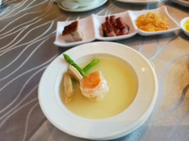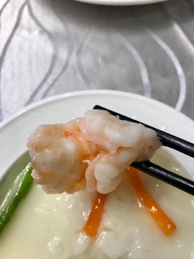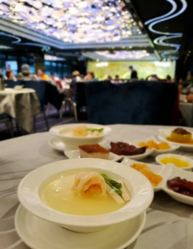 唔係誇張,真係覺得呢間酒樓嘅裝修係我見過其中一間最靚嘅, 紫紫銀銀嘅天花燈, 還有一個超長嘅魚缸, 入邊唔係蝦蟹龍蝦, 而係好多 觀賞魚, 好似個水族館咁, 見到真係好興奮呢度提供少有嘅龍井茶, 第一浸入口甘味很重, 係龍井茶嘅特點,第二浸變得好甘香, 很喜歡黑蒜螺頭燉雞湯出色, 黑蒜特有的味道能夠完全帶出來, 內裏的湯料也有不少的黑蒜、螺頭和雞肉,材料靚,唔錯玉環鮑魚盅,鮑魚配節瓜,簡單的菜式,到不過不失,鮑魚都爽口西施蛋白蝦球是比較清雅的一道菜,蒸蛋白唔算特別滑溜, 但與爽口的蝦球很配搭燒味拼盤有雞、鴨、叉燒和海蜇, 味道可以,不過海蜇有點沙福建炒飯煮得好,炒飯粒粒分明, 配料很多,有蝦、雞肉、帶子等等,口感豐富紅豆沙是是日甜品,起沙,帶陳皮味…查看更多