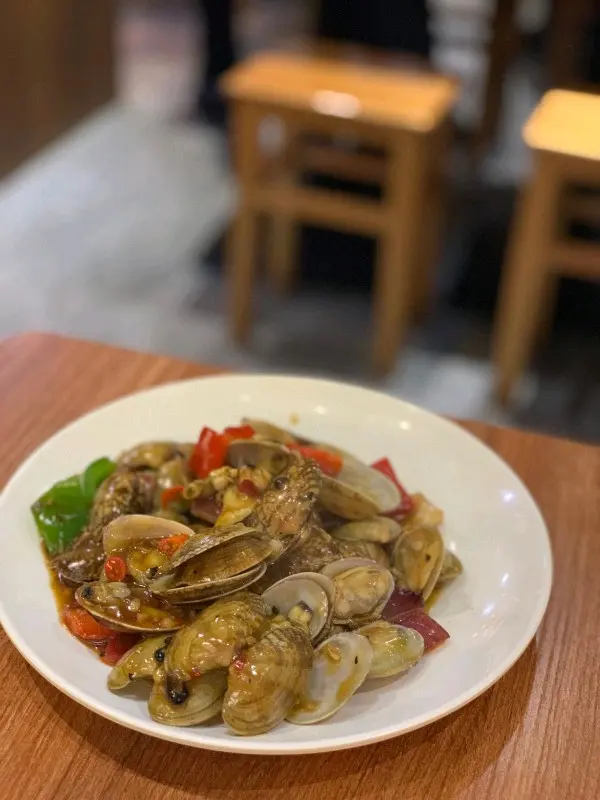. 餐牌加埋牆上手寫菜牌, 有多款小食, 碟頭飯及小炒選擇, 價錢大部份都係$28, $38, $68, $88, 最貴都係星斑$198, 一行幾人食多幾款都好實惠. 欣賞小店做街坊生意, 就算你係一支公來食個碟頭飯都係$38, 份量唔小又真材實料, 真係益街坊, 所以就算最近市道差, 但店內仍然座無虛席. $38海南雞飯餐, 老爸讚不絶口, 誠意製作絶無將貨就價, 無骨雞肉有雞味, 浸過冰水既雞皮下有啫喱又爽脆. 油飯帶有香茅味, 原來不只白米咁簡單, 是溝了糯米, 所以口感煙韌, 有點像香芒糯米飯. 而餐湯內黃豆也無味精. 小炒又點少得海鮮, 以香港仔煮法- 白灼/椒鹽/豉椒炒任客選擇:- 蜆更係豉椒炒先惹味, 新鮮乾淨無砂, 只得1隻無開殼, 豉椒汁辣味適中, 連配菜既甜椒洋蔥都沾鋪豉汁.- 椒鹽鮑魚, 粉漿薄而香脆, 鮑魚夠軟身, 廚師細心地一開二更容易入口, 令我期待下次來要試椒鹽鮮魷/九肚魚.- 白灼東風螺, 必備甜醬辣醬, 十足少時在香港仔食既風味, $38份量頗多.- 菠蘿咕嚕肉, 似是豬扒肥膏少啖啖肉, 酸甜汁卦汁很開胃, 佐飯最佳.- 蒜蓉炒豆苗, 鑊氣夠油份少, 菜苗翠綠不黃, $58真心抵食, 大排檔都不止這價錢.兩款原盅杏汁湯, 相同杏汁湯底, 杏仁味極濃, 沙沙地口感尤如加了鹽既即磨杏仁茶. 花膠本身味淡, 質地偏結實不黏口; 反而豬肺較出色, 口感脆脆.最後加插一大碗海蟹魚茸粥, 即叫即煮所以都要些時間等候, 但值得換來一整隻花蟹, 雖是小蟹, 但肉質鮮甜; 白色魚茸為粥底增添海鮮味, 粥底夠棉不是水汪汪, 粥內更加有幼幼既薑絲驅寒僻腥.欣賞廚師無味精但又做到原汁原味, 經濟實惠有冷氣做到大排檔風味, 仲要無加一, 讚!