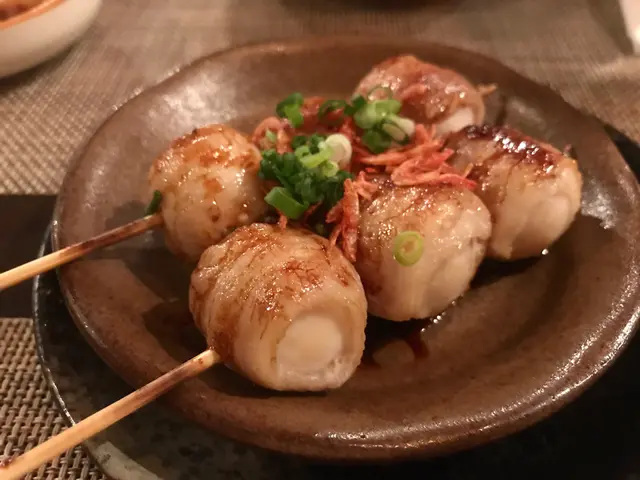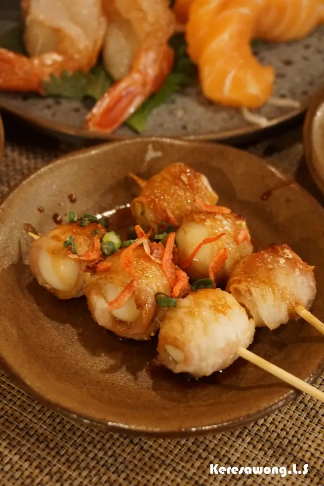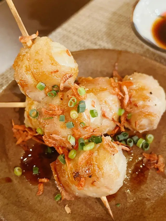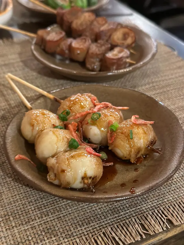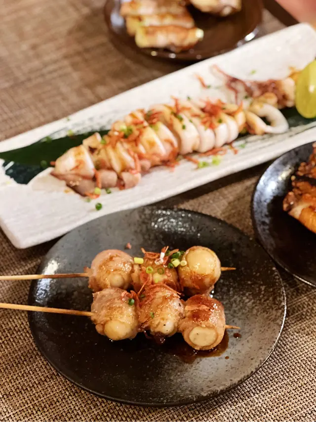 這間居酒屋位於銅鑼灣,主打日式串燒,專門搜羅不同的豚肉。店內環境寬敞舒適,裝修以簡約的日系木板為主,擺放不同的毛公仔及日本海報等,如置身日本居酒屋一樣。前菜 - $32水果番茄酸甜可口特別醒胃。明太子沙律 - $48一粒粒明太子富鹹香,入口爽脆富彈性,好清新。刺身盛三款 - $168四片雪白肉厚的帆立貝純淨甘甜;兩隻肥美的赤蝦爽口有彈性,淡淡的甜味,口感軟綿;四片細嫩鮮美的三文魚甘腴肥美。槍魷魚 - $188鮮嫩的槍魷魚比起一般的墨魚或魷魚,有著更鮮甜的海水味,入口柔中帶韌。西班牙黑豚豬頸肉 - $38/1黑毛豬豐富的油花分佈平均,豬頸肉質感脆爽嫩滑,充滿肉汁,油而不膩。露筍豬肉卷 - $38/1脆嫩的綠蘆筍好清爽,包裹著肥美的豬肉添油香。豚肉鵪鶉蛋卷 - $36/1一串有三粒圓潤的鵪鶉蛋咬開軟滑帶鹹香,香脆的豚肉添油香。雞翼串 - $38/1一串兩隻肥美飽滿的雞中翼外脆內軟,雪白的雞肉嫩滑多汁。雞軟骨串 - $28/1爽脆的雞軟骨有肉有軟骨,好惹味。日本長蔥 - $28/1比一般的蔥多帶了點甜味,更有些味噌調味。乳酸梳打 - $38酸酸甜甜的可爾必思梳打,有著清爽的碳酸氣泡。巨峰梳打 - $38乳酸梳打基底,再加入香甜的巨峰提子漿,充滿果香。…Read More