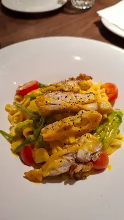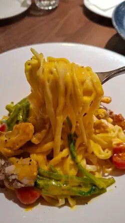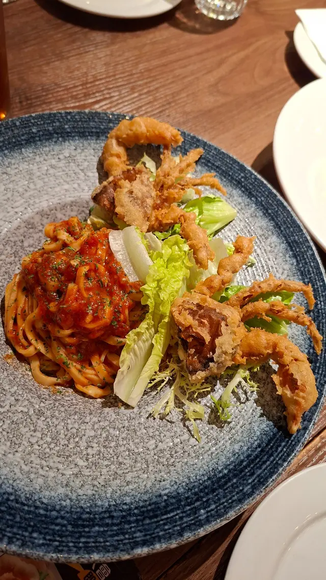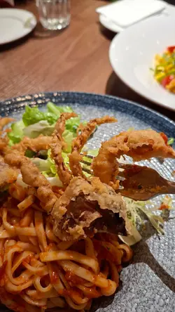 軟殼蟹配蕃茄濃汁鮮製意粉,色彩繽紛,蕃茄濃汁酸甜味令人食慾大開。軟殼蟹外酥內嫩,味道鮮美。意粉口感彈牙且吸附咗醬汁,加上香草提味,令每一口都充滿驚喜。