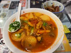 知道{蒙麵}至少要等1個鐘先有得食,為咗減少輪侯時間,我哋喺鋪頭開之前半個鐘就到達排隊🚶🏼♀️🚶🏻🚶🏻♂️開店前排隊嘅人唔算多,所以可以第一輪就入座,唔洗等1個鐘咁耐🥹鋪頭小小,每碗麵同小食都係逐一製作,非常之用心❤️亦都因為咁,需要用更多嘅時間等候,想食就要俾耐性⌛️✴️新鮮花甲蕃茄薯仔湯銀針粉✴️❤️❤️好鐘意依個湯!一定落咗好多蕃茄,煲咗好耐先會有依個味道同濃度,而且仲有大大嚿薯仔,飲湯都飽😍花甲份量好多,脹卜卜夠哂甜,邊食邊感到好幸福☺️✴️韭菜餃蝴蝶腩香菇貢丸河粉✴️同樣湯底🍅🍅韭菜餃皮十分之薄,餡料豐富,推薦👍🏻✴️辣味魷魚✴️唔食得辣嘅人真係要斟酌,因為呢個辣味好刺激💥我要等到最後食晒碗麵,再用蕃茄湯洗一洗先至食到😂✴️糖心滷蛋✴️偏鹹,但滷蛋嘅時間剛剛好,呢種流心蛋黃真係好吸引🧚♀️✴️蜜汁叉燒串✴️調味都幾濃,叉燒比較乾同難以從竹簽中扯出~無想像中咁好食,試過一次就算🙈…查看更多