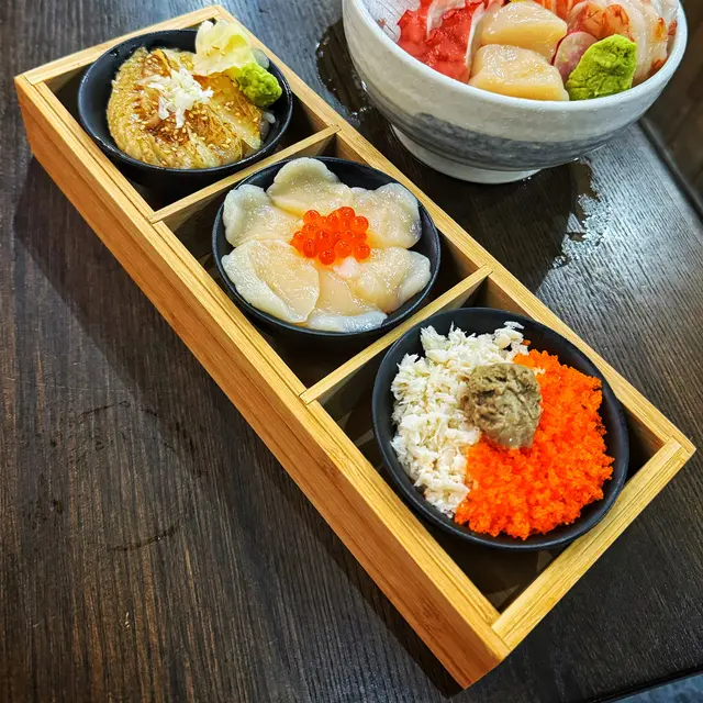 迷你丼係九款中揀3款,樹熊揀了究極親蟹丼同赤蝦3本丼,熊妹就揀了火炙三文魚油甘魚丼。