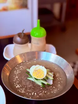 冷麵超解饞,碗裡麵條泡在冰涼的高湯中,中央點綴半顆蛋