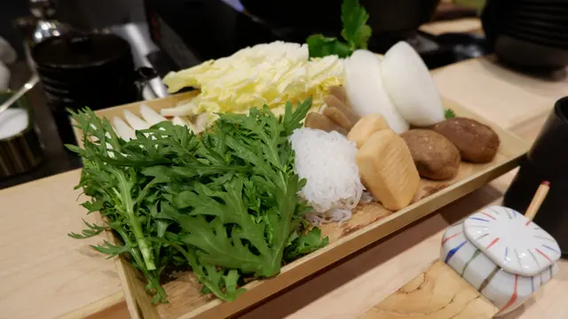 蒸し物:小碗中嘅燉蛋特色在於以昆布舖面,軟滑輕盈嘅蛋蛋滲透出芳香與清甜,又潤又暖胃。動手備煮食物前,師傅先展出食材並為其略作簡介。木盤上有節令嘅蔬菜。大碟上紅白雲石紋理分明嘅手切A4和牛源自近江