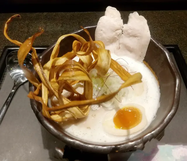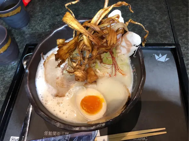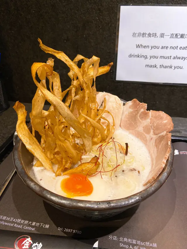 原本唸住嚟依度食軟殼蟹🦀香辣🔥拉麵🍜,點知無晒。見到一人套餐都幾抵下😚(包含主食、小食和飲品),於是揀左。主食揀左餐廳嘅主打——金鶴雞🐥白湯拉麵,小食揀咗唐揚炸雞,飲品揀咗一罐可樂。🏷一人套餐($128)金鶴雞白湯拉麵嘅湯底係薄薄醇醇嘅忌廉湯,不太油,濃度啱啱好😚。上面炸到金黃色嘅係牛蒡絲,非常脆口同埋香甜😋。拉麵嘅軟硬度煮得啱啱好👍🏻。半熟蛋嘅熟度都煮得啱啱好👍🏻。雞肉同豚肉係喺熟嘅肉塊度切片出嚟嘅,肉質軟熟、新鮮。由於已經係熟,如果浸喺熱熱嘅湯度太耐,肉質會變硬。所以適宜直接食用,唔洗刻意浸落去湯度。拉麵裏面仲有啲蔥頭同埋竹筍,增添味兒😋。另外有3件唐揚炸雞,可以點胡椒鹽食。3件雞嘅size比我想像中大件😆,啖啖都係肉😋。廚師👨🍳炸嘅火喉啱啱好,唔會過火、太熱氣👍🏻。…查看更多