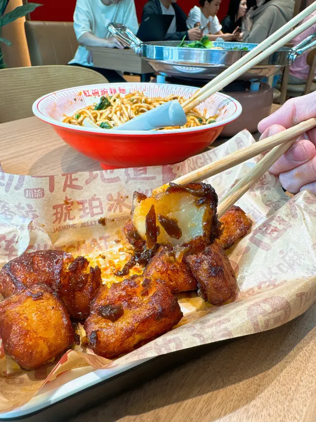 遇見小麵在內地已經連續熱門多年,近日首次來到香港。地處黃埔交通便捷,地鐵站出來直走兩分鐘即到,位置剛好在轉角。主營以四川小面、抄手、小鍋冒菜等特色小吃為主,菜品辣度可以選擇,如不太能吃辣也不影響品嚐。當晚抵達時已近七點,而且下雨,但門外仍然排起長龍。新聞話店面面積兩千餘呎,當時已座無虛席,看來很受歡迎。而且由於主打親民小食,店內佈置比較緊湊,一人或兩人來就餐,很大機會需要拼台。坐定後掃碼點餐,只支持電子支付,頗有科技進步不等人的感覺。小麵是重慶特色美食,包括豌雜麵、牛肉麵等等,當中用豌豆與雜醬為主料的豌雜面最經典。這次自然少不了店內最出名的紅碗豌雜面,下單時除了基本選擇,亦有滷蛋、大腸等不少配菜可選擇。紅碗豌雜面麵條緊實有咬勁道,醬料味道濃郁,麻味十足,還可搭配自取炸豌豆和酸豇豆,味道口感都會有所提升。小鍋冒菜同樣是重慶經典,類似一人份小火鍋,有清湯不辣的選擇,同樣有多種配料可以選配。鍋巴土豆在內地也是街頭巷尾的熱門小吃,番薯塊炸至表面形成硬殼再拌上醬料,推薦麻辣口味,整體味道是麻、辣、鮮、香、軟、酥。…查看更多