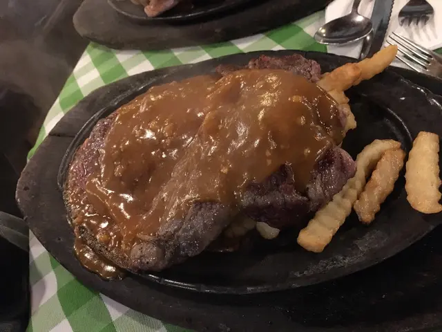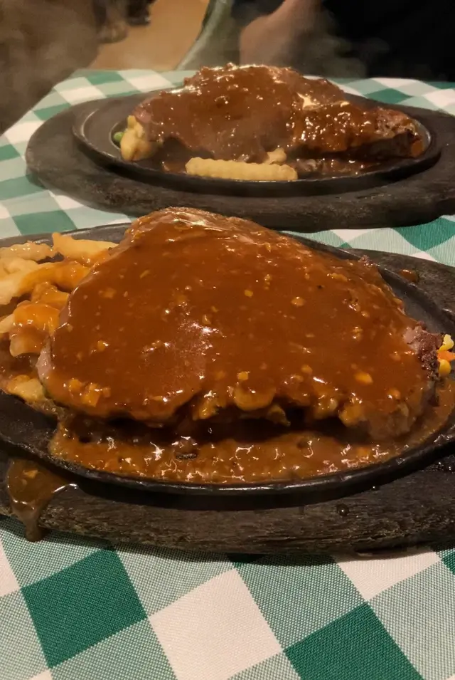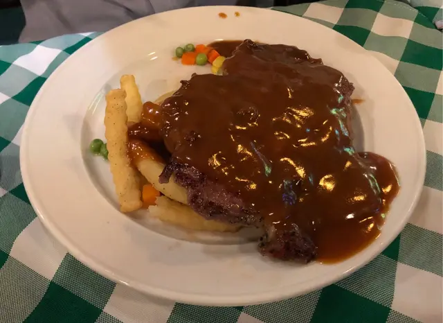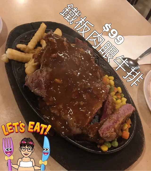 在旺角逛街,晚餐突然想吃鐵板据扒,於是上網找到了第尾牛扒。點完餐後,過了十秒便送上餐包和餐湯。(沒有誇張,真是十秒)餐包溫暖,我點了羅宋湯,用料十足,而且味道濃郁,絕不是淡而無味的羅宋湯。忌廉湯我覺得較普通。鐵板肉眼牛扒我叫了五成熟,蒜蓉汁。牛扒來到時已經預先淋上醬汁,少了在面前「咋」一聲的效果。牛扒底下墊住薯條,蕃茄和我最討厭的三色豆。而主角肉眼牛扒,熟度適中,肉質軟腍,尚算有口感,但肉味稍為遜色。不過$99+1有餐包餐湯牛扒連飲品來說,要求也不能太高。