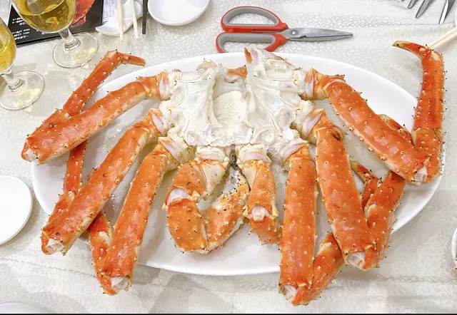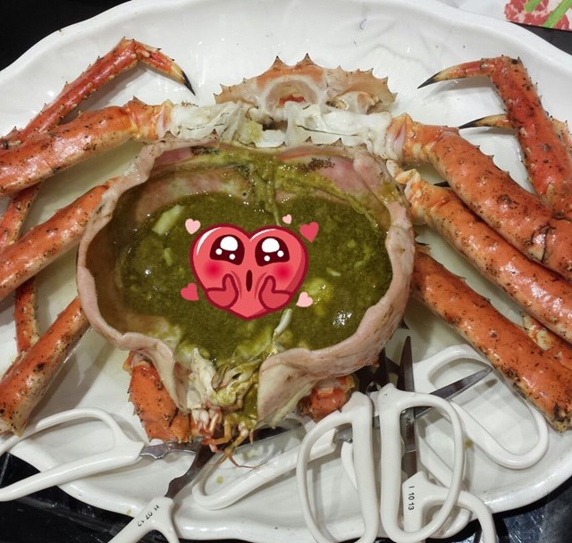 阿拉斯加長腳蟹 …我地五人選約4斤重的…蟹身肉地厚鮮甜味十足!!...真讚唷!! …蟹蓋o既膏我地就將佢刮晒落去蒸鍋下面既粥底度!!...令成個粥鮮上加鮮!!