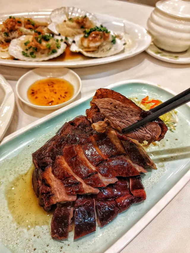 同行朋友是個中式菜愛好者,這次和他到酒家吃飯,這間酒家菜式頗特別,而且菜式名稱很吸引啊!💕前菜小吃不是一般酒家提供的花生,而是由紫菜和鹽調味而成的腰果、杏仁等的堅果 ,好吃到我停不了口啊!茶我們點了普洱茶,茶味香濃,很適合解油膩。不得不提一下,茶壺精美,外形顏色好特別呢😍一系列的古典花圖案餐具充滿中式味道~晚市組合A $228♡金蒜銀絲蒸鮮元貝或空運蟶子(4隻) 🥢必點🥢由於蟶子只剩下一隻的關係,所以職員合併了三隻元貝給我們。很大隻,新鮮彈牙,吃得出十分新鮮~配上蒜蓉和粉絲,真心非常好吃啊😋!•配小菜一款點了好味醬啫啫豬手煲🥘醬汁惹味,豬手外皮煙韌有咬口,內裡有薄片的油炸鬼,非常香脆!♡陳皮脆香燒鵝皇 $108例牌 🥢必點🥢燒鵝皮閃亮亮的,上菜時,我的口水已流到嘴邊啦🤤~鵝油味香濃,很好吃😋。雖然是例牌,但都很多肉啊!晚飯優惠價絕對物有所值,一定要點呢!♡金獎蝦醬海珊骨$108炸得金黃香脆,外脆內軟,肉多骨少,肉是肥瘦各半,油香味香濃,帶有陣淡淡蝦醬味。♡川貝海底椰燉鱷魚湯$43.8 🥢必點🥢足料鱷魚肉、紅棗、雞肉、椰肉放得滿滿的,真材實料👍火候很夠啊!喝下去有陣陣的椰香味,味道清甜,感覺非常滋潤有益~♡桃膠西施杏仁茶$28濃郁杏仁味,帶有石磨的口感,味道不會太甜,即使老一輩也很適合。加上養顏的桃膠,感覺很滋補美膚啊!這裏的甜品頗有特色,還有雪燕焦糖燉蛋,可惜售完了,下次有機會要嚐嚐呢!✔️餐廳設加一服務費…Read More