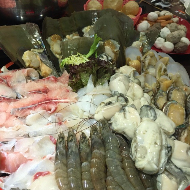 。海鮮盤有聖子丶鮑魚丶大蜆丶龍躉片丶蝦丶蠔丶油魚丶鲩魚等多款海鮮,而且還有四款可以免費添加