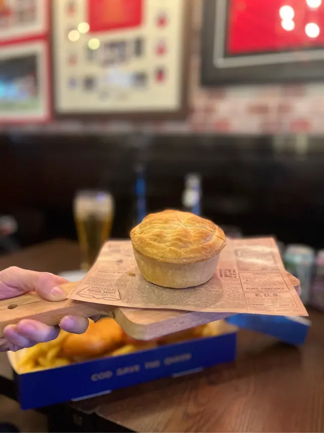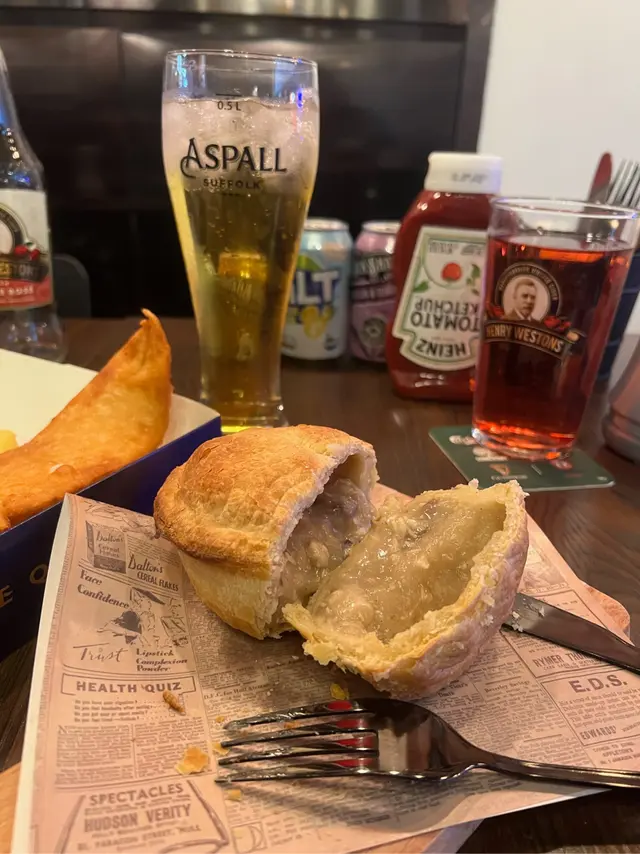 聖誕假期同朋友喺銅鑼灣食飯,我哋行經耀華街見到有間好好節日氣氛嘅餐廳🎄,叫「The Chippy」。再望餐牌,發現原來係食英式炸魚薯條Fish & Chips。店舖木系嘅裝潢滿有英倫風格🇬🇧,四周圍貼滿海報,整體感覺舒服又好Chill。同時,門口開得大,冬天有生風吹入嚟好通爽,唔焗促。餐廳主打英式食物,入口唔少英國地道品牌嘅食品同飲品。雖然部份產品唔係自家製作,但至少專賣呢類菜式嘅餐廳喺香港唔多🇭🇰,幾有特色。炸鱈魚薯條12oz(招牌)($198),你無睇錯,🐟炸魚超大條,我無磅喺手所以佢足唔足12安士我就唔知,但就肯定長超過12吋,同我手臂有得揮💪。炸皮記得要襯熱食🔥,佢算薄身,食落微微脆,唔油膩。炸魚用上鱈魚Cod Fish,魚肉肉質幾有彈性,而且亦算嫩滑,最重要係夠厚肉,大大啖肉,咁先至有滿足感。🍟搭配嘅係手切粗薯塊,薯肉好綿,份量多到食唔晒。炸魚薯條跟配三色醬🚦,左至右分別係青豆醬Mushy Peas、咖哩醬Curry Sauce同牛肉醬Gravy Sauce。三款之中咖哩最惹味,一啲都唔辣,似日式溝印度風🥘。我平日唔食青豆,不過變咗蓉又唔錯喎,就咁食好過沾魚食。牛肉醬貌似紅豆醬,但味道比想像中淡。炸熱狗腸(12吋)($48),珍寶香腸好大條🌭,外層同樣包住炸漿,質感稍為硬啲,但都脆。入面嘅香腸係豬肉腸🐷,口感彈牙,富鹹香。炸熱狗腸用紙皮包住,食用方便。雞肉磨菇批($78),餐廳選用英國牌子嘅肉批Pukka Pie🥧。肉批焗起鬆化挺身,酥皮具牛油香,切開後肉餡一湧而出,入面係忌廉磨菇雞肉🐔,食落都OK,幾Creamy,而且係似曾熟悉嘅味道(罐頭湯?)。呢度提供多種醃菜Pickles,全部來自英國。醃菜配炸物一流,因為可解膩🤤。我要咗小黃瓜Gherkin($15),一條都切到成十幾片,口感爽脆多汁,酸酸哋帶少少甜,好開胃,又易入口🥒。飲品方面,店員推介試吓英國汽水🥤,齋睇餐牌我完全無概念係乜味,有見及此,佢好好人拎晒出嚟俾我揀🤣。我哋要咗BEN SHAWS嘅Bitter Shandy以及Dandelion & Burdock,每罐$55,有啲貴🙈,但當試新嘢。前者有啲似檸茶溝啤酒🍻,有0.5%酒精;而另一款味道幾獨特,係蒲公英加牛蒡味,但我飲唔出,哈哈。啱啱過咗世界杯🏆⚽️,再一次見到1966年英格蘭嘅勝利海報,就諗起暫時仲未Coming Home……🏴。另外,仲有老闆嘅珍藏:碧咸親筆簽名波衫。總括嚟講,難得喺香港食到英式正宗炸魚薯條,味道不俗,情懷十足👍,感覺堅係有啲似喺英國嘅酒吧,過咗一個愉快嘅晚上。…查看更多
