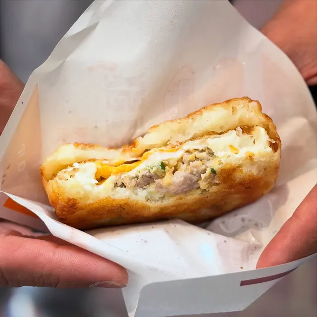 呢日諗住喺紅磡食飯,點知經過呢間舖頭,屋企嗰一大一小「包餅」粉絲就俾門口啲嘢食吸引咗過去😌門口個姨姨話平時呢個雞蛋肉漢堡,一出就好多人排隊買,見姨姨咁講,當時又未有人排,一於睇住佢煎,買個試吓~我哋一買完,就開始有人排隊,姨姨無講大話😂😂#雞蛋肉漢堡 $12一咬落去,個面煎到非常脆口!!😳佢唔係exactly包嚟,係類似粉漿煎到好脆,有啲油,不過我覺得可接受😂中間夾住蛋同肉,有少少似豬柳蛋漢堡咁豬肉梅菜餡餅 $16爆餡,咬落Juicy,不過呢個相對普通啲呢間舖頭細細,淨係得外賣,個雞蛋漢堡有啲驚喜,可以去試吓~…查看更多