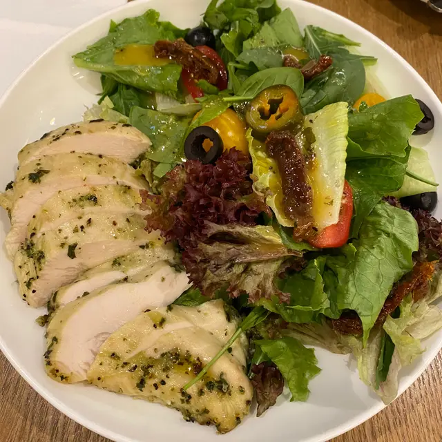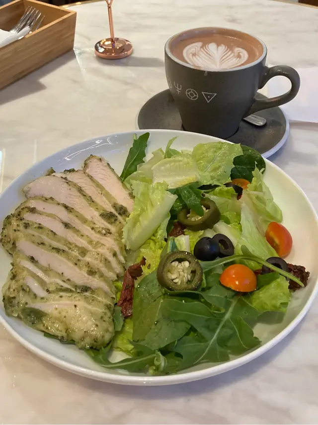 第一次食Weekday lunch time 一個人嚟食,都要等15分鐘,而場內九成係OL。服務員帶位入座後自己出counter買野食,等送餐嚟而餐廳限時90分鐘(with food) or 60分鐘(drinks only)點左一個lunch set- 青醬雞扒沙律$79- 熱伯爵茶朱古力(大)(+$15)份量好大!菜同雞扒都好足料!(我見好多食客都會點嚟share)沙律好新鮮!包括火箭菜沙律菜蕃茄仔乾蕃茄等等雞扒好嫩,一啲都唔鞋!而且雞扒上碟係暖咖!以為成碟都會凍冰冰,所以好驚喜!個青醬汁令人好開胃!