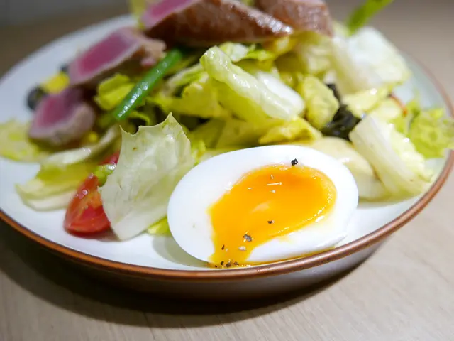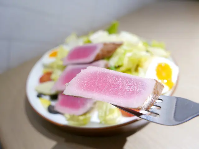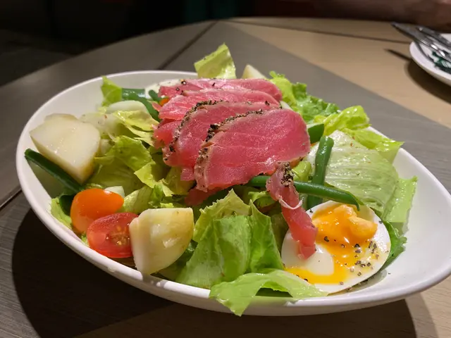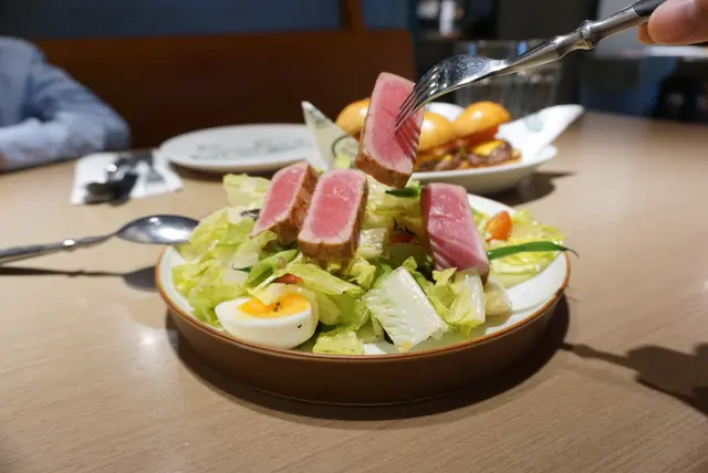 香煎吞拿魚尼斯沙律,唔同平時食嘅沙律得菜同埋菜,配搭係薯仔、法邊豆、蛋、橄欖、蕃茄,吞拿魚略燒過,較硬身同埋有芝麻包住,比較香脆同飽肚嘅沙律。