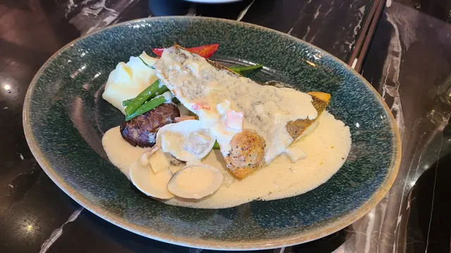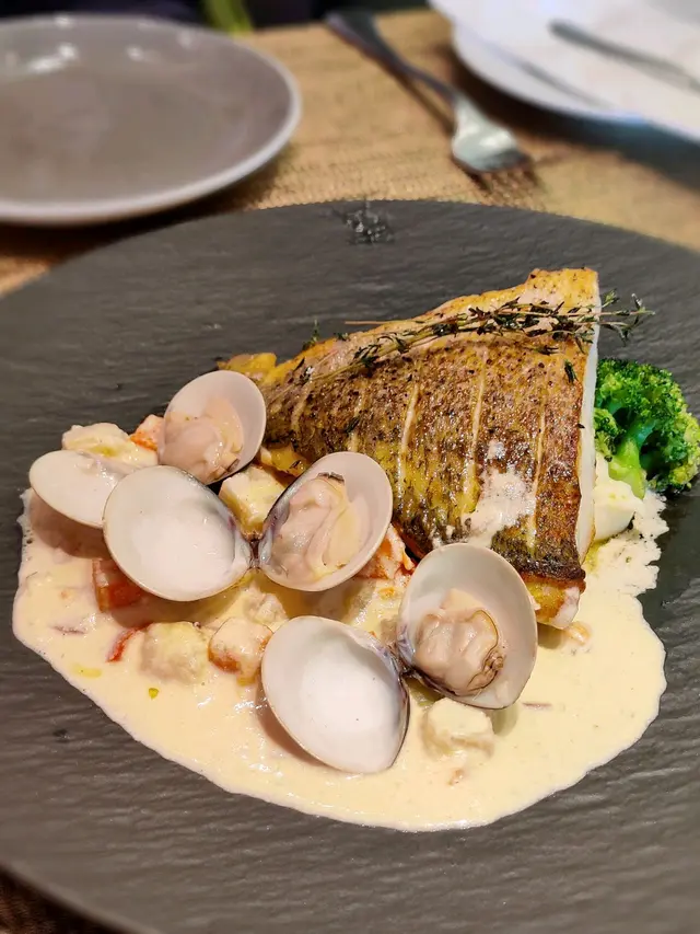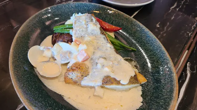 餐廳:Briketenia地點:北角匯菜式:日式法菜餐牌:午市套餐包前菜同主菜,同咖啡或者茶。可以加錢要甜品或者升級飲品。主菜10選1,前菜6選1。餐包一客四件,有大有細,外皮烤得香脆,而且暖暖地,最正係個忌廉醬,超滑溜,令塊包超好味!是日餐湯是日餐湯係南瓜湯,服務員先上一個熱既大兜,原來已經有幾粒新鮮菇仔,然後服務員再係你面前加湯。個湯好滑,甜度適中,溫度夠熱。鵝肝焦糖燉蛋配田園沙律 跟餐加$48 另加一呢個鵝肝焦糖燉蛋配田園沙律係餐廳招牌菜式,一定要試試。鵝肝真係用燉蛋兜上,面頭一層焦糖面,同埋加少少紅色酸莓醬。鵝肝好滑溜,配焦糖面真係外脆內滑,而加埋酸莓醬可以稍稍中和油膩感,呢個配搭非常出色。配有四小塊香脆吐司。田園沙律係一碗加左適量沙律醬既沙律雜菜。紅酒燴牛面頰配新薯及蔬菜 $218 另加一紅酒燴牛面頰有三大件,啖啖肉又超淋,好正,仲有筋添。個汁都好入味。面頭灑上蔥花。伴有五條豆角,一片翠玉瓜,一件西蘭花,一片紅燈籠椒同冬菇一片,蔬菜種類豐富。連皮新薯一件開四邊,好易食。香煎時令鮮魚配海鮮忌廉汁 $238 另加一是日鮮魚為鱸魚。鱸魚一大片,煎得皮脆肉嫰,無骨,方便食用,仲有兩隻連殼蜆仔。個海鮮忌廉汁好滑又唔會太重口味,配魚食好夾。蔬菜同紅酒燴牛面頰一樣。另外有好多滑溜薯蓉。熱檸水,凍檸水(跟餐)熱檸水同凍檸水每杯各有三片檸檬,糖水同糖都另上。總括而言,食物質素幾好。入面裝修高檔次,環境舒適,服務員有禮而上菜有效率。Business lunch可以考慮呢度。…查看更多