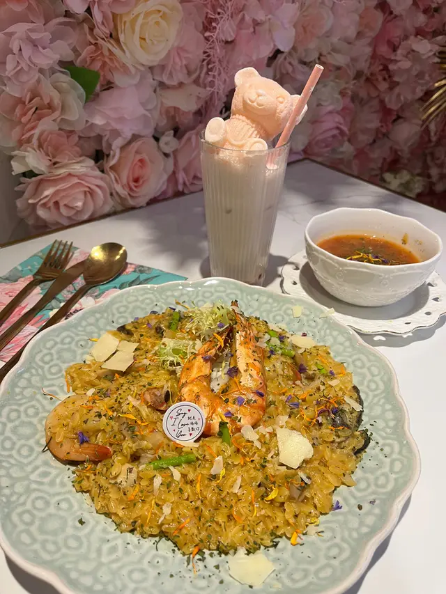 今日約好閨蜜一同去銅鑼灣很出名的打咭餐廳。同好姐妹 gathering。進入門口就看見一隻很大的賓利兔🐰店員跟他玩耍很像一隻狗仔🐶全場佈置是花海,連天花都有佈置,影相完全沒難度。店員還會化身攝影師幫你影相,教你擺poses,你就像是model。除了有set lunch之外,餐廳更設有靚靚下午茶,我們二人點了 set lunch。鮮大蝦龍蝦汁米意粉第一次吃米意粉,質感似risotto,一粒粒分明,每粒都有龍蝦參味道,大蝦🍤都完全唔係雪藏味道,吃下去很彈牙新鮮。南瓜汁野菜米意粉米意粉全部用南瓜汁釀製,好健康好清新,絕對適合我多菜少肉嘅理念,就如其名字「就是偏偏喜歡你」2杯飲品蜜桃小熊乳酸C- 有一隻83冰冰浮在杯面好可愛,朋友說味道有點像益力多,有淡淡蜜桃味道。Hot蜜桃薑蜜 - 有很多細小薑粒mix & match粒粒蜜桃好有口感。是日Lunch Soup 忌廉南瓜湯 飲完暖笠笠。埋單共4百幾元。 一個米意粉120-168元。…查看更多