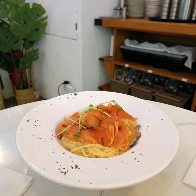 前日放工後去到山林道食晚飯,見到一間個名好有趣嘅cafe店,裝修都簡約精緻,決定入去食下。我同細佬叫咗兩個set dinner, 包括前菜、主菜同飲品。📌前菜:沙律我地兩份嘅前菜都叫咗沙律,沙律菜新鮮份量足,上面仲有少量芝士粉做點綴,增添口感。📌鮮忌廉野菌煙三文魚天使麵 $138質地柔軟嘅天使麵同濃郁嘅忌廉汁完美融合,煙三文魚份量充足再加上菇片,令整碟意粉口感層次豐富。📌波士頓龍蝦(半隻)配白松露忌廉手工扁麵 $158半隻肥美嘅波士頓龍蝦,肉質鮮嫩彈牙,龍蝦上更鋪滿融化咗嘅芝士!意粉入面嘅松露汁非常濃郁,松露香氣撲鼻而來,鍾意食松露嘅細佬非常享受呢碟意粉。📌朱古力牛角包窩夫 $68朱古力雪糕濃郁順滑,雪糕放喺窩夫上面本身好怕窩夫會淋哂。點知,窩夫仍然保持到酥脆嘅口感!旁邊仲有朱古力嘅最佳拍檔--香蕉作伴碟。餐廳優惠多,我地喺門口見到晚市堂食人均達$150 就可以用$1 購買每日唔同款嘅特定小食/甜品,真係好抵食。📌芭菲杯 $1我地食飯嗰日係星期二,$1有一杯賣相精緻嘅芭菲杯!裡面不同種類嘅雜果、堅果、早餐脆脆混合喺雪糕及乳酪中。味道酸酸甜甜,口感極之豐富,只係$1!…查看更多