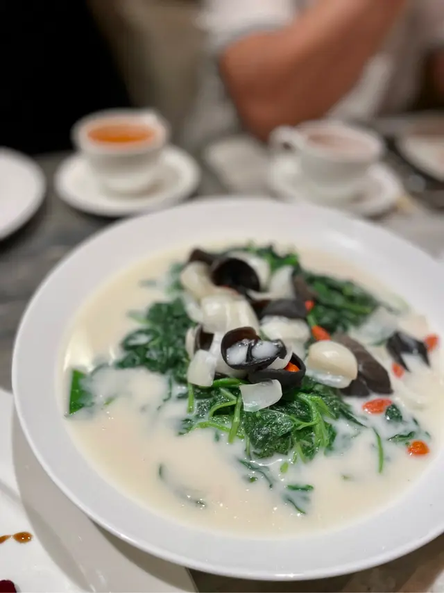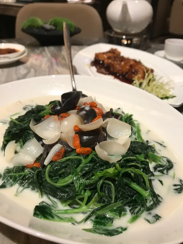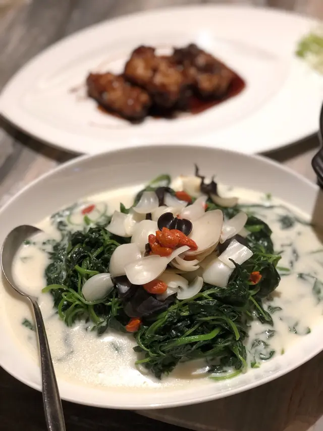 同友人慶祝生日,佢係一位對中菜幾高要求既人,上網搵到哩間位於鷹君中心的中菜廳,食物同環境都幾吸引,就訂座黎一試。極品蜜汁叉燒 $208厚切叉燒,肥瘦均勻,沾上蜜汁,做得高水準,每一啖都好林又爽口。第一道菜同朋友已經留下好印象,期待打後的每一道餸菜。焗釀鮮蟹蓋 - 芝士焗 $158賣相非常有趣,金黃色既芝士內有乾坤!內有滿滿的蟹肉,混有芝士、羅白絲等配料,估唔到裡面係有咁多拆肉蟹肉,食得勁方便。濃湯花膠雞絲羹 $198/位女士們都鍾情花膠哩個養生食材,哩個羹清清地十分足料,花膠切條,有木耳絲同雞絲。巧手醋香黑豚肉 $268哩碟既黑醋醬汁做得非常出色,係哩度既推薦小菜,黑豚肉沾滿醬汁,好開胃。鮮杏汁杞子百合浸時蔬 $238雪白色既杏汁煮蔬菜第一次食,所有食材都特別適合女士,美顏明目,杏汁濃郁。窩燒海味飯 $238一上枱香氣撲鼻,個飯調味得恰道好處。黑糖桃膠薑汁3.6牛乳奶凍 $68/位哩道甜品絕對值得一食再食,我地都大讚,超滑身既奶凍,混入黑糖同薑汁,冰涼甜品,面頭有我最喜歡的桃膠。…查看更多
