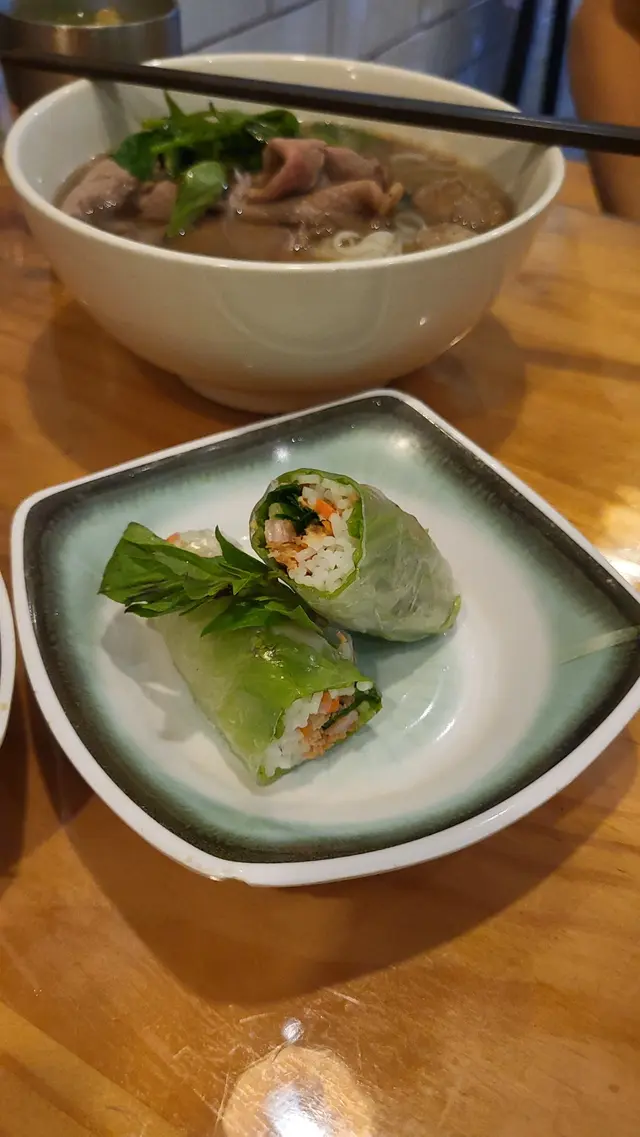 星期六同爹哋嚟灣仔食lunch見呢間越南餐廳幾有feel而且想食法包所以去試吓🇻🇳Weekend都有lunch menu,有湯河、撈檬、法包餐包小食、飲品▶️ 木瓜絲沙律 開胃小食主要係醃紅蘿蔔、青木瓜絲同青瓜🥒醬汁酸酸甜甜,唔辣面頭灑上少許花生碎、香草調味▶️ 鮮蝦燒肉米紙卷 (+$10)米紙卷外皮煙靭有咬口入面包咗生菜、大量米粉、蝦花生味道幾出🥜另外點啲魚露更好食▶️ 越式雞絲法包 ($98)賣相唔錯,好大份雞絲份量足,啖啖都有肉🐔調味似海南雞,入口唔乾配菜有醃蘿蔔、紅蘿蔔絲、紫洋蔥、芫荽葉🌿味道豐富略嫌法包覺得唔夠燶脆🥖同埋唔夠多肝醬稱唔上一個正宗法包,比較似港式化嘅有餡豬仔包🙈▶️ 至尊牛寶湯河 ($108)配料有兩粒牛丸、多塊薄切牛肉、湯白蘿蔔牛肉ok唔太肥🐂湯底味道較清淡,主要靠香葉調味河粉質感正正常常,冇話特別好食,但唔會易斷一pat pat▶️ 檸檬特飲 入面有條香茅同青檸,飲落酸酸甜甜夏天飲好清爽🍋🟩▶️ 越南啤酒 (+$20)👨🏻’s-食物賣相ok,肉類用料充足不過感覺上係local化嘅越南菜法包冇預期好食… 可能要試佢哋招牌豬肉丸法包😗然而服務態度好,座位舒服尤其鍾意呢度裝修,係老闆喺越南會安親自拎返香港,難怪非常有越南風味🏮仲留意到佢有免費Wi-Fi &插蘇位價錢以灣仔區嚟講算平民,$100/人有小食主食飲品原來佢哋已經經營咗10周年,需要支持吓香港小店~…查看更多