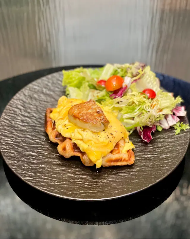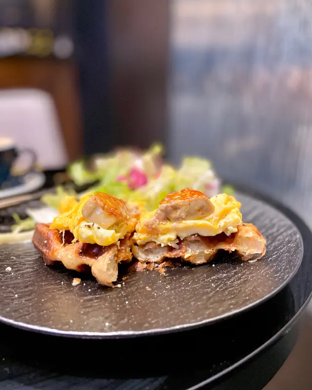放工成日經過呢間Cafe,望到入面裝修係幾classy嘅工業風,一直都好想試但係次次都已經閂咗門,上星期日放假特登過嚟呢頭try try佢。鵝肝炒蛋Croffle $72本身好鍾意食croffle,呢碟croffle完全冇令我失望。炒蛋生熟度啱啱好,鮮嫩香滑,而且份量足夠覆蓋成件croffle。鵝肝相比之下口感稍為遜色,係室温嘅,而且冇煎過嘅香脆感,但係入口依然油香四溢。雖然張相見唔到件croffle,但係佢絕對係呢道菜嘅主角,上枱熱辣辣,香脆可口富油香,層次分明,令成道菜口感豐富。Flat white $40咖啡飲落偏nutty,冇酸味,入口順滑。拉花有别於一般嘅心形拉花,係天馬造型,激發我嘅少女心。Cafe仲有一隻好可愛嘅貓店駐守,門口又有拉卡位,絶對係一間內外兼備嘅cafe。…查看更多