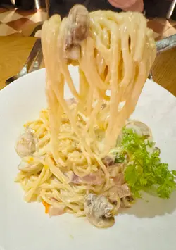 今日同朋友喺荃灣行街,順便同佢慶祝下生日,揀左間打卡一流西式餐廳PARKSIDE@NINA,食物質素又高質,值得再回訪👍🏻🫶🏻風乾火腿蘑菇薄餅一上枱已經聞到陣陣黑松露香味,餅底薄脆帶麵粉香,風乾火腿鹹香細膩,蘑菇鮮甜多汁,兩者完美襯托,整體層次豐富,食落香氣滿滿🤤🫶🏻鹹蛋卡邦尼意粉意粉軟硬適中,鹹蛋與卡邦尼兩者好match,搭配煙肉同蘑菇,口感creamy而唔膩,風味獨特😋🫶🏻特色木化石朱古力餅朱古力質感豐富細膩,味道香濃帶微苦甜,餅底酥脆香口,造型好似木化石般有趣又吸睛,甜品控必試🤤…查看更多