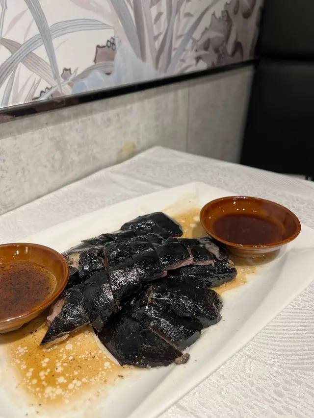 中菜館位於佐敦,分為兩層,食嘢要上上層,裝潢行蘇杭古典風,岀面仲有標位方便泊車👍🏻 中菜館菜式好有特色👍🏻,仲以海鮮作主打,款式多元化。✨茶芥$15/位,前菜$25✨另設加一-💕前菜竟然唔係花生🥜係焦糖核桃😳超香甜香脆😍第一次係覺得抵比前菜$$😂😂-💕 黑松露玻璃燒鵝 $148👅好味指數:9.5/10黑色既燒鵝🖤賣相一流!特別到一上枱,其他食客望哂過黎😂 燒鵝皮香脆有油香,而且有濃郁黑松露味😍好入味,鵝肉肉質都好嫩滑,再配秘製黑松露酸汁,超開胃,又特別又好食!😍💕 蜜汁脆燒鱔 $268👅好味指數:8.5/10鱔外皮燒到脆卜卜😳肉質肥美彈牙,原本已經有搽上蜜汁去燒,另外再淋上蜜汁,更香甜惹味🥰-💕牛魔王叉燒 $268👅好味指數:8/10又一特別菜式,係用牛整既叉燒😳❗️需時大概20分鐘,一上枱熱到噴煙😍💨,好似骰仔牛咁,燒到淺粉紅色有焦香,肉質軟腍☺️油脂感比較重。-💕 法式蜂蜜芥末蝦球 $148👅好味指數:7.5/10份量都幾多,大概有8粒左右,蝦肉好大一粒好爽口,面層淋上蜂蜜芥末醬,如果兜埋蝦球一齊炒/另外再比醬汁就更正了🤣。-💕 甜品👅好味指數:9/10每人贈送牛奶布丁😍濃醇奶香,細膩香滑,食落唔會太甜,可以單買就好了😂!-環境:7/10服務:7.9/10好味指數:8/10回頭率:7.5/10…查看更多