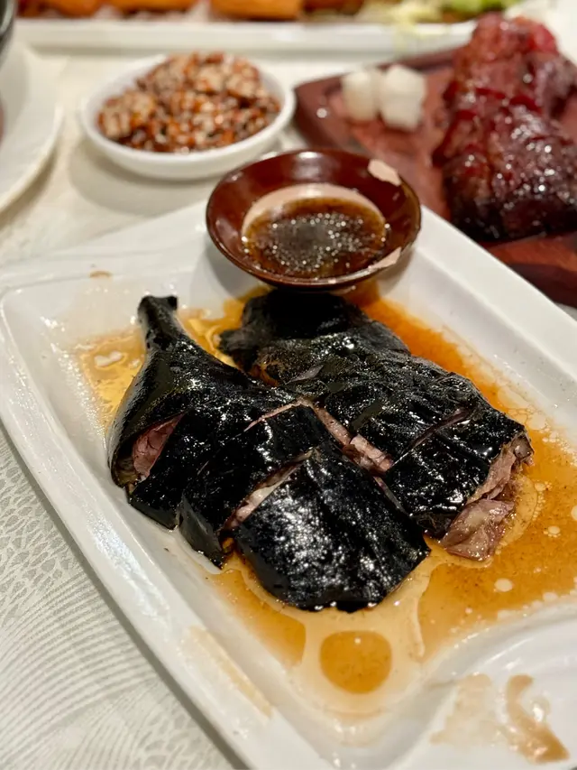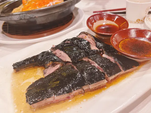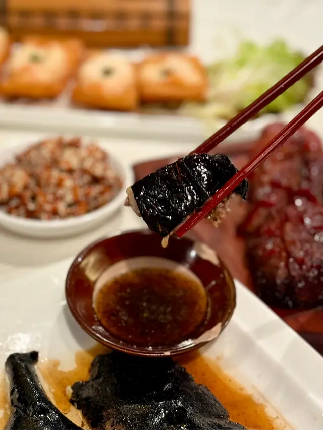 香港傳統手工粵菜越嚟越少,今晚同屋企人去咗開業多年飯店,每一道菜都充滿了廚師既用心和創意。入口水墨畫屏風裝修和小橋充滿着中國特色。一坐低就送上小食,合桃超脆好香口。懷舊蝦多士多士炸得酥脆金黄,蝦肉鮮嫩彈牙,一道懷舊嘅菜式。即燒乳豬外皮烤得香脆金黃,咬下去已經聽到脆皮聲音,肉質軟嫩,經典粵菜。黑松露玻璃燒鵝燒鵝皮係黑松露嘅顏色,皮薄脆口,黑松露味濃郁,鵝肉嫩滑多汁,甜酸醬亦加入咗黑松露,奢華嘅享受。伊比利亞叉燒皇用左高品質既伊比利亞豬肉整,肥瘦比例均勻,外層燒得焦香,肉質細膩。糯米炒膏蟹膏蟹肉質鮮甜,超多蟹膏,糯米粒粒分明,吸收哂蟹膏既精華。飯後甜品奶凍同樣出色…查看更多