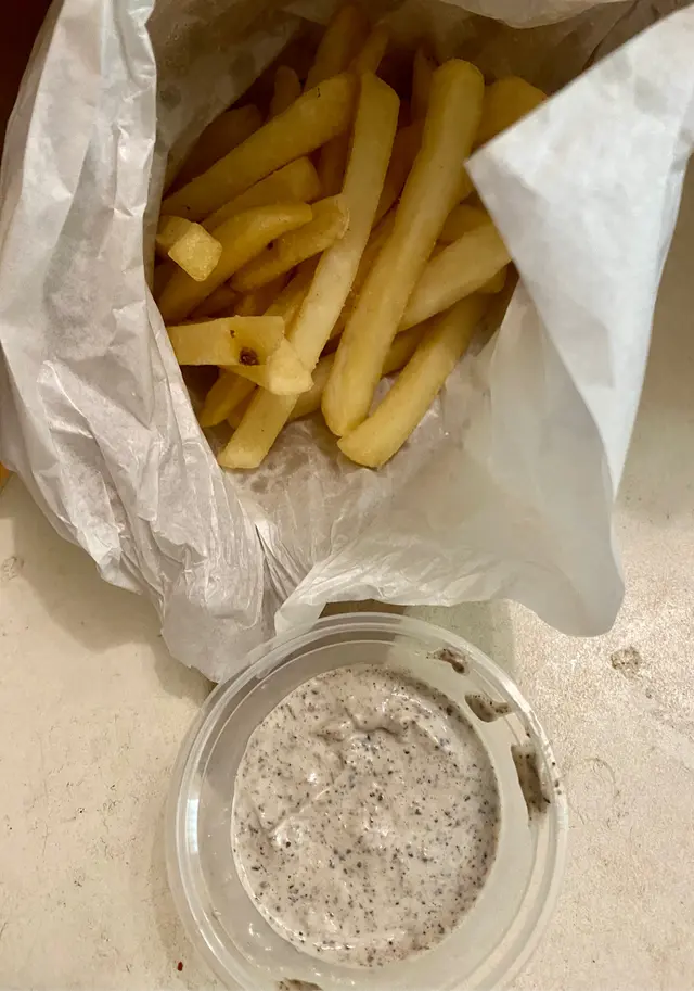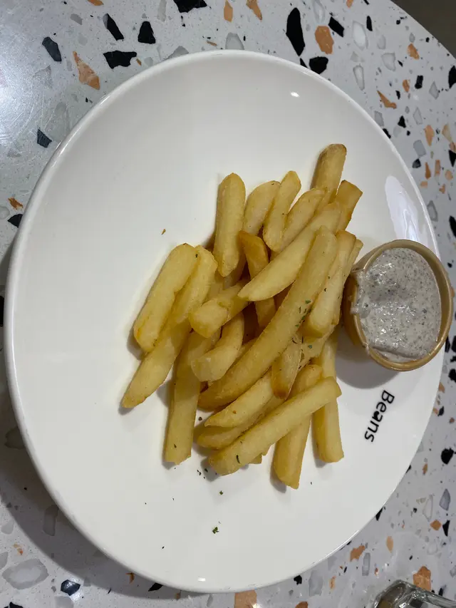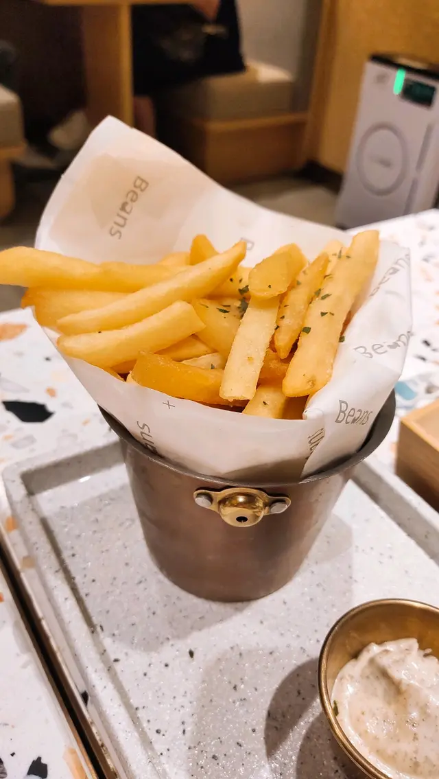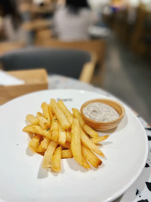 。餐廳環境算幾大,落單方式可用Qr code,唔識用都可叫侍應幫手,我地就慢慢研究,因為食物款式都算幾多,仲有d加配要求要一樣一樣咁撳,所以都搞左差不多15分鐘,對於不喜歡用Qr code既朋友最好都係搵返侍應幫手啦。黑松露醬薯條第一份到既餐,上菜速度好快,落單後5分鐘唔洗都開始有野食,呢份薯條用粗薯,薯味算ok,黑松露醬味不太濃,薯條比較複雜,有d就熱加脆,有d就暖同少少腍,睇黎係新炸同舊炸溝埋左,唔怪得上菜咁快,都明白既咁多人下下即炸真係炸到天光,但相對變得無咁好食。青咖哩軟殼蟹意大利飯呢個飯先講缺點,1.唔夠熱,2.d飯比較硬,硬到好似唔夠熟咁,小弟比較少食意大利飯所以唔知正宗係咪咁,優點都有既,調味幾唔錯,青咖哩夾做意大利飯味道原來都幾夾,軟殼蟹同樣都係唔夠熱,不是新鮮炸,成個飯有好有壞,所以只係一般。黃金蟹肉意粉意粉口感少少硬,我都覺硬左dd可接受,醬汁調味都算豐富,蟹粉幾足蟹肉就少d,同樣問題不夠熱。白松露醬烤肉眼排5成熟呢份牛扒擺盤算幾靚,牛扒都煎到5成熟,厚度大約4分左右未到半吋,食落都有肉汁,火喉算唔錯,比較可惜係呢塊牛扒本身唔算好靚,同埋比較細塊,底下跟左d話係蒜香薯蓉但無蒜香味,最奇怪係說好的白松露醬呢?彩虹茶拿鐵造型就靚啦,老友揀左少甜,就話比較淡喎。踏進了冰山呢杯特飲有d驚喜,材料用左藍柑,荔枝同椰青水,杯邊加左d海鹽,另外加左d碎冰,飲落甜甜地又帶少少咸,用粗管飲又飲到d碎冰,飲完透心涼,果然係入左冰山