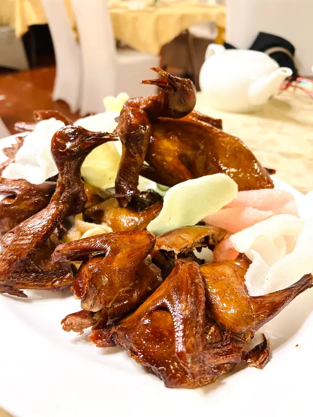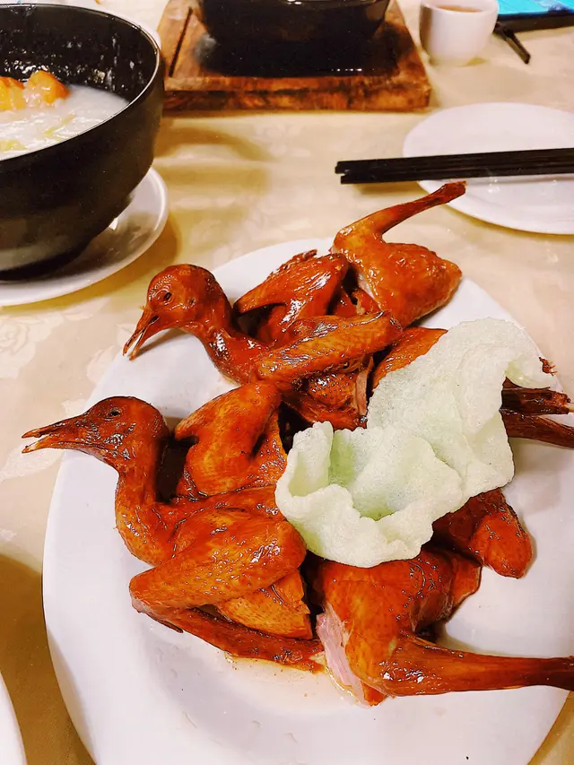 自從嫲嫲過身之後我哋就無嚟過,都有差唔多十年,今次帶埋2歲嘅Carlo三代同堂一齊重溫龍華酒店,回憶過去。Carlo 聽住婆婆講佢50年前,當年仲係做囡就同朋友嚟食乳鴿。仲有好多想當年故事😂 我哋叫返以前次次嚟都會叫嘅幾道菜,包括乳鴿、紅燒豆腐、薑蔥魚雲同沙田必食嘅沙田雞粥。乳鴿$98係貴啲,但絕對值呢個價,肉質鮮嫩多汁,皮脆味美,烤得恰到好處。紅燒豆腐亦非常美味,豆腐口感柔軟滑嫩,醬汁香濃。薑蔥魚雲,啲薑切得好薄,薑同蔥都可以食埋,好味。但對我黎講,沙田雞粥係有少少驚喜,粥濃稠滑,雞肉鮮嫩多汁,仲帶有微微嘅薑香味道。今次係Baby Carlo第一次食乳鴿,食得津津有味,仲有現場駐唱,Carlo 一邊食一邊跟住歌聲搖曳。唯一美中不足係個洗手間比較多蚊,同埋有少少味。如果可以改進埋就好啦!…查看更多
