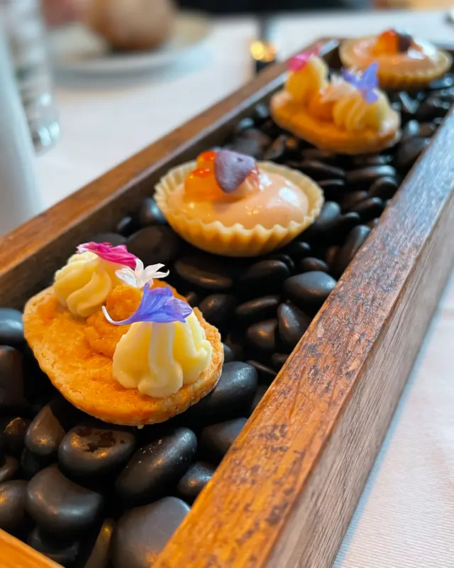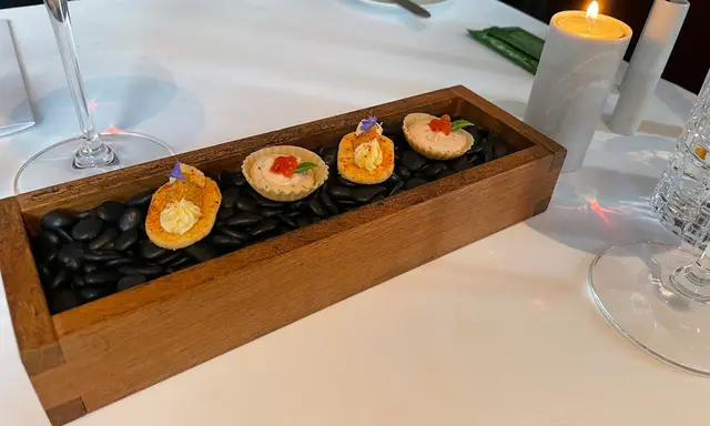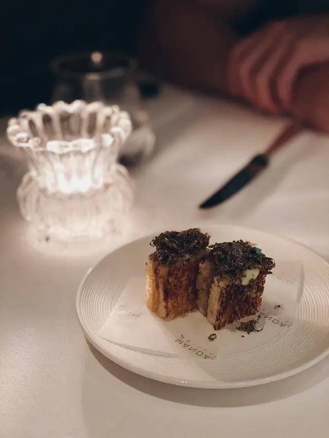 朋友離港在即,需很久才回,臨行一聚,相約於酒店扒房。餐包外皮香甜包肉軟熟,上面灑了些鹽粒,增添少許鹹意。可選配牛油或橄欖油,能夠一次過盡享兩種風味。一大粒類似炸肉丸的頭盤,真身原來是牛肉他他跟酸種麵包多士的混合物。本體肉質鬆軟,炸完之後增添香口感。碗裡先放有數粒龍蝦肉,侍應再倒龍蝦湯進去。湯的蝦味濃重,烯杰適中,不漿口,配襯的龍蝦肉爽而鮮美。香煎鵝肝油脂豐盈,少少調味已經足夠,吃下是滿口的幸福!襯上的炸麵包粒增加脆度;而蘋果粒能抒解膩氣。魚卷包有帶子、虎蝦、松露、煙肉等,肉感豐盛,爽口的蝦肉、松露的香氣以及鹹香的煙肉影襯出魚肉的鮮美。我們只是叫了英式西茶,詎料店方驚喜地奉上迷你甜品!紅莓啫喱糖、馬德蓮蛋糕與朱古力布朗尼,小人最愛蛋糕,跟西茶最合拍。高水平之作,締造了一次美好的回憶!…查看更多
